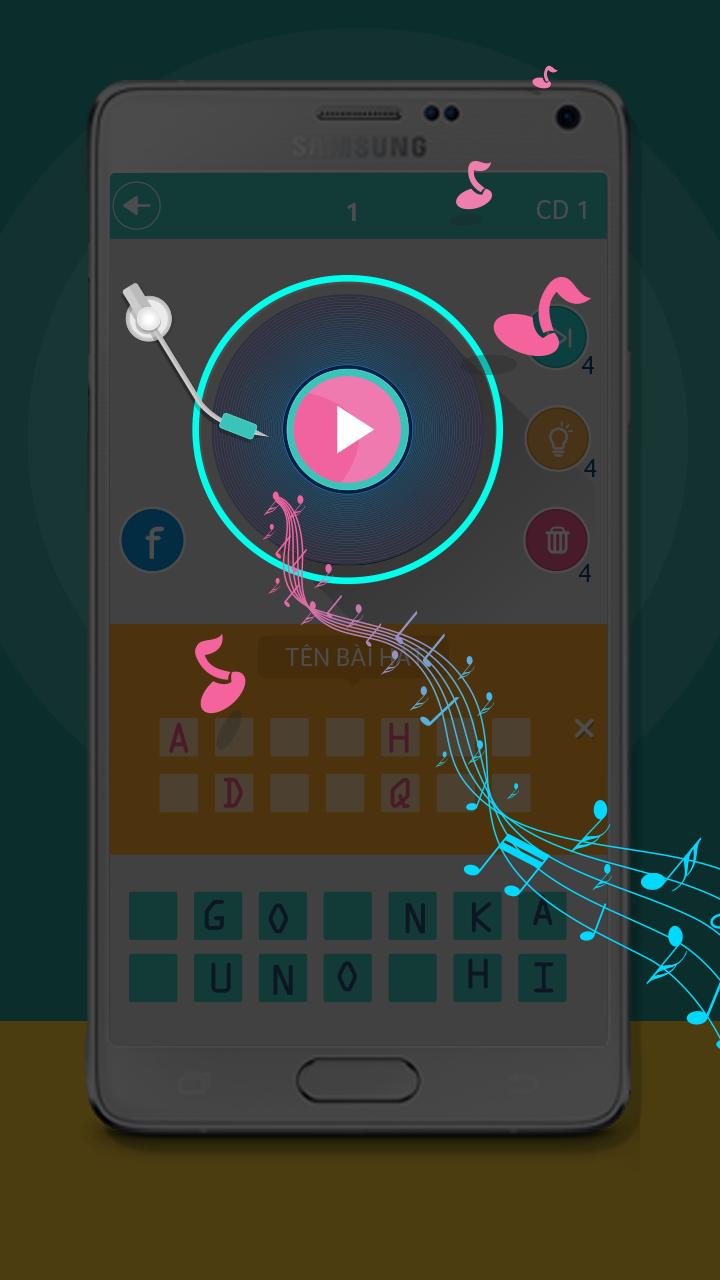 Chasing music to catch words - hard to be easy, easy but difficult. Each song only plays for about 10 seconds, your task is to guess the name of the song, or the singer singing the song. The gameplay is quite similar to the game show chasing words, you use the letters available to fill in the answer box. You will have 3 effective assistance: transfer cards if it is difficult, open the answer box, or delete the redundant letters. Also indispensable help "ask friends via facebook".