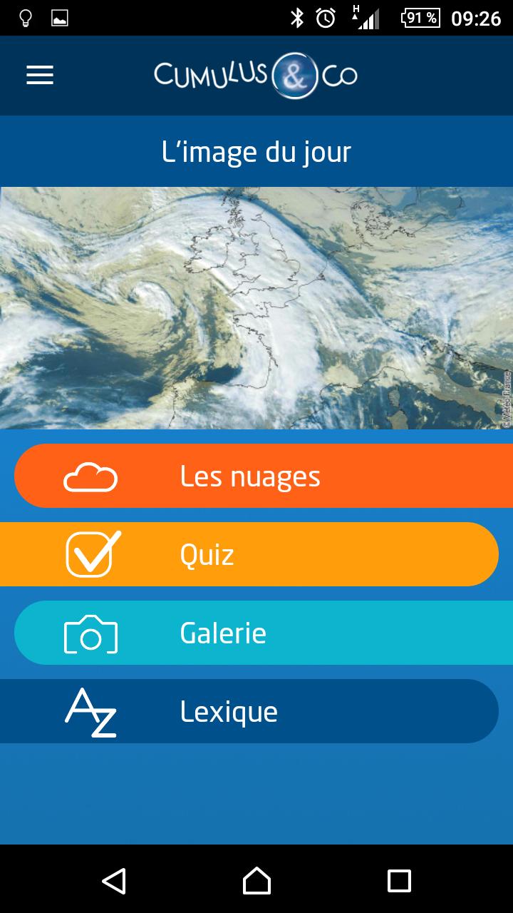 With this app, you are going to discover the different kind of clouds, learn to recognize them and test your knowledge by playing different thematic quizzes, by level, to finally share your score with your friends on Facebook or Twitter.