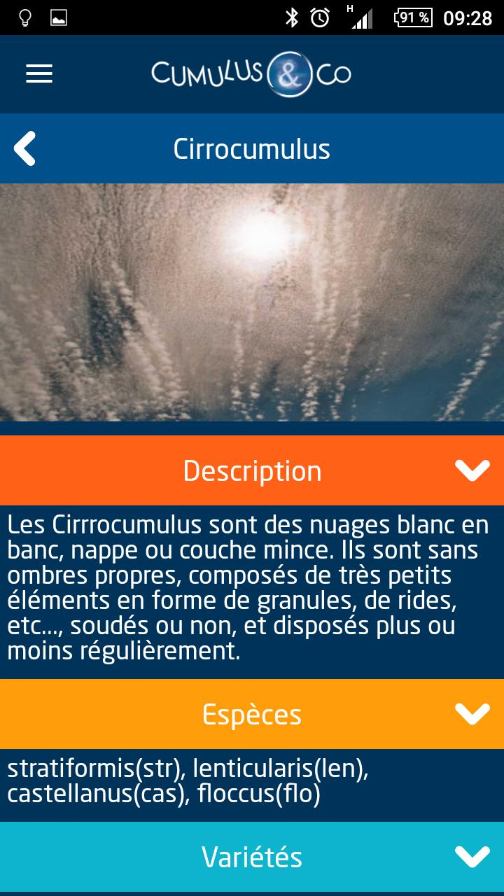 • A "Learn" section presents a complete encyclopedia on clouds, with explanatory diagrams, a catalog of the various clouds arranged in alphabetical order, complete descriptive sheets as well as characteristic photos. The classification section presents all the clouds according to their genera, species, varieties and particularities.