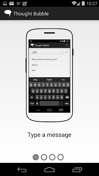 Let everyone know what you are thinking with Thought Bubble. Type a message or choose one from a fully customizable list of thoughts. Then hold your phone or tablet up to your head to show what's on your mind. The words of your message are automatically sized to fit perfectly inside a Thought Bubble on your phone's screen.