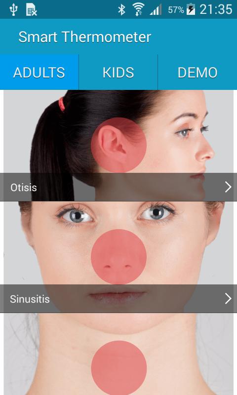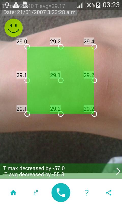 By using this application, you can measure not only body temperature, but also local temperature in the problem area and reveal thermo signs of many dangerous complications in time. Getting a color thermal picture of the problem area is the unique feature of Smart Thermometer app. The area of the increased temperature is colored in red. When you see the increase of temperature, you know that something is wrong and you can get on-line or off-line doctor’s consultation timely. After revealing the problem, you can also monitor the effectiveness of the therapy prescribed by a doctor. Just measure temperature in the problem zones by using this app in the same way as it is stated in the manual of your infra-red thermometer: by contact or contactless. It is also important to measure body temperature in the area sated in the manual of your thermometer (forehead, mouth, ear or armpit, etc).
