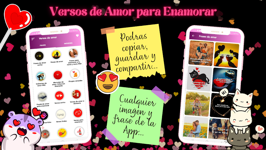 Are you looking for verses for my love in the entire Play Store and you can't find them anywhere? Do not despair, here is the App that will save your skin and make you a seducer. Here you will find the best messages to fall in love with a woman from all over the world. You can also send sincere phrases of love to the man you like. There is an exclusive section called love verses to fall in love with a woman that you can use with the girl of your dreams; she will fall at your feet. And for women we have beautiful love verses to conquer the man they want. Whether you are a man or a woman, you have to know that human beings admire details quite a bit. ??? And with this application you can be a retailer 365 days a year. ???