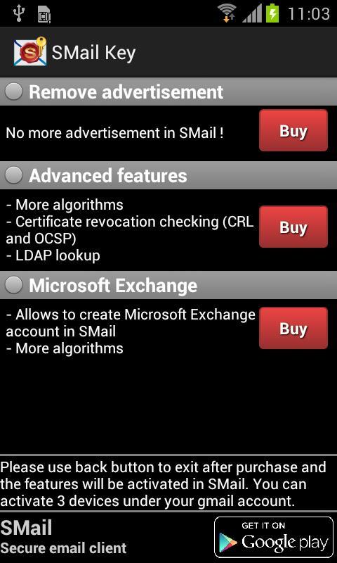 هناك ثلاثة خيارات يمكن شراءها. كل واحد منهم يتيح فقط ميزة واحدة في Smail: