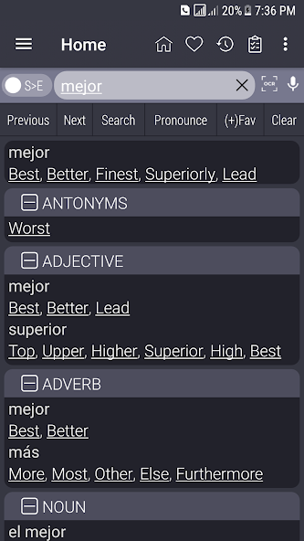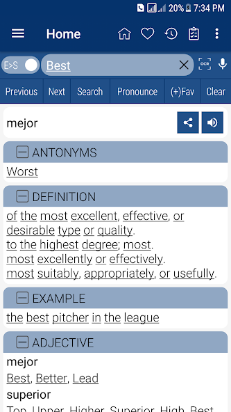 • البحث في اتجاهين: التبديل بسلاسة بين الإسبانية إلى الإنجليزية والإنجليزية إلى الترجمات الإسبانية.