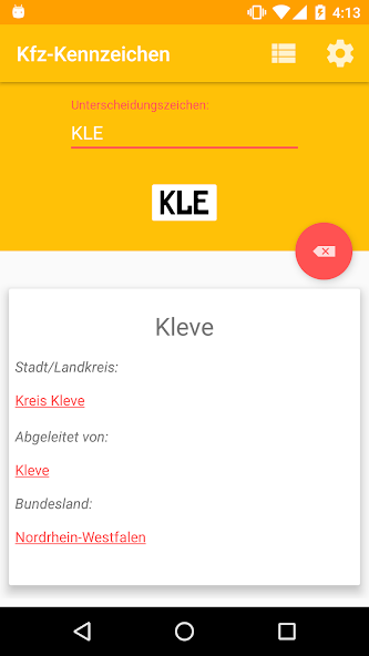 ابحث عن المدينة أو المقاطعة أو المؤسسة التي يشير إليها الاختصار على لوحة أرقام السيارة الألمانية. يعمل أيضًا على الطريق ، بدون اتصال بيانات (باستثناء الروابط الخارجية ، بالطبع).
