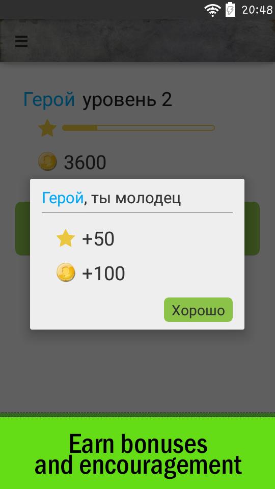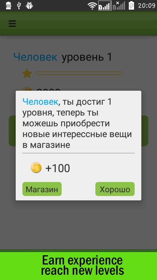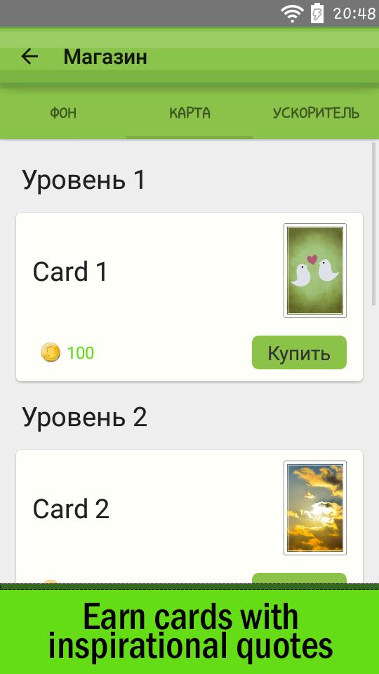+ تلقي الجوائز في المتجر. ليس من الممل أن تعيش عندما يمكنك شراء شيء ما. يمكنك الشراء: بطاقات مع اقتباسات ، تعزيزات وخلفيات جميلة لجعل تطبيقك أكثر جمالا.