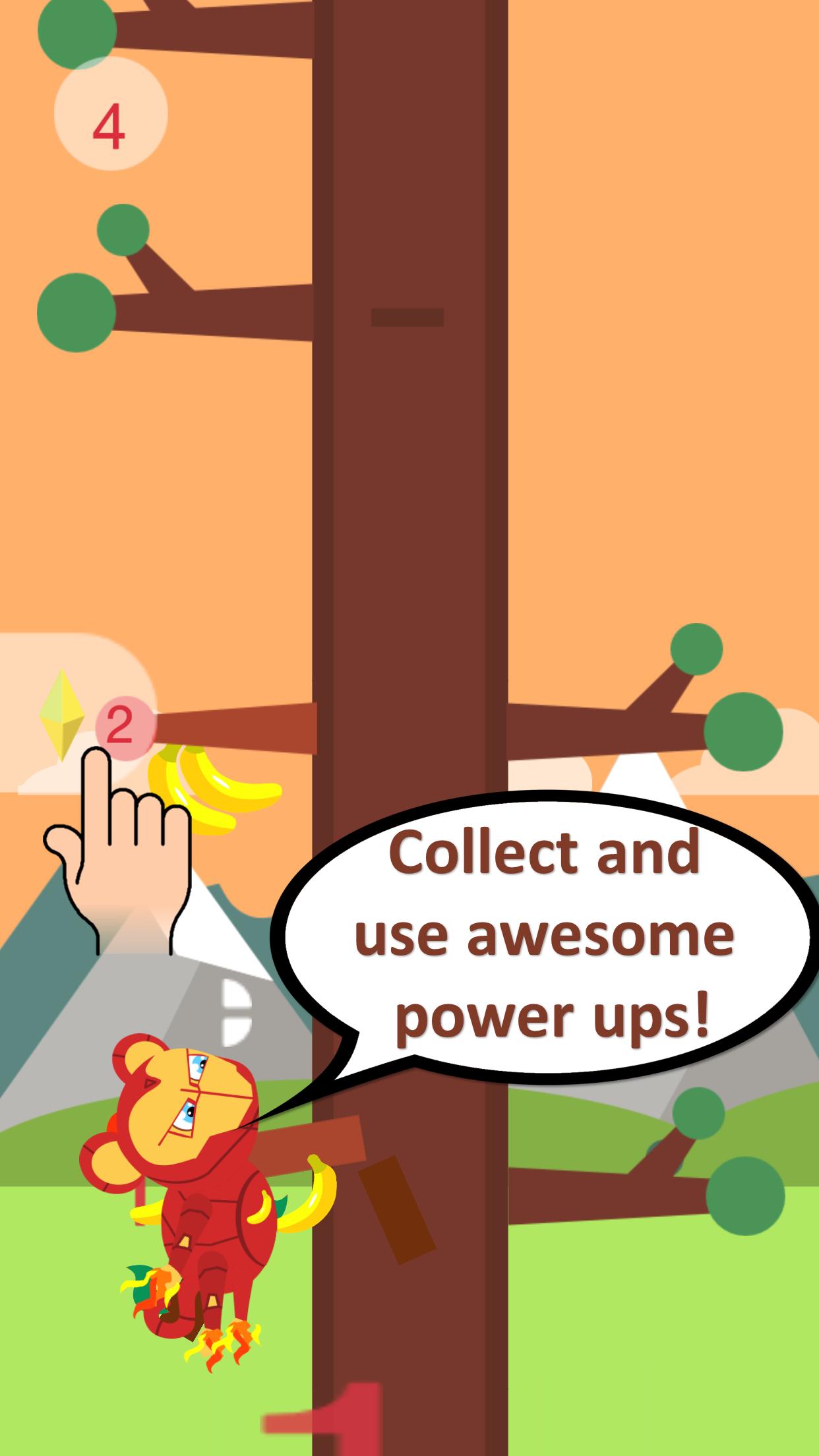 الآن عليك مساعدة متسلق الشمبانزي السريع لتسلق جذع الشجرة بسرعة والبقاء في مأمن من جميع الأعداء المحظوظين. هناك UPS Power مثل Rocket Chimp التي ستساعد Bonobo على جمع نقاط القوة لتكون أكثر ثباتًا وأسرع في لعبته للتسلق.