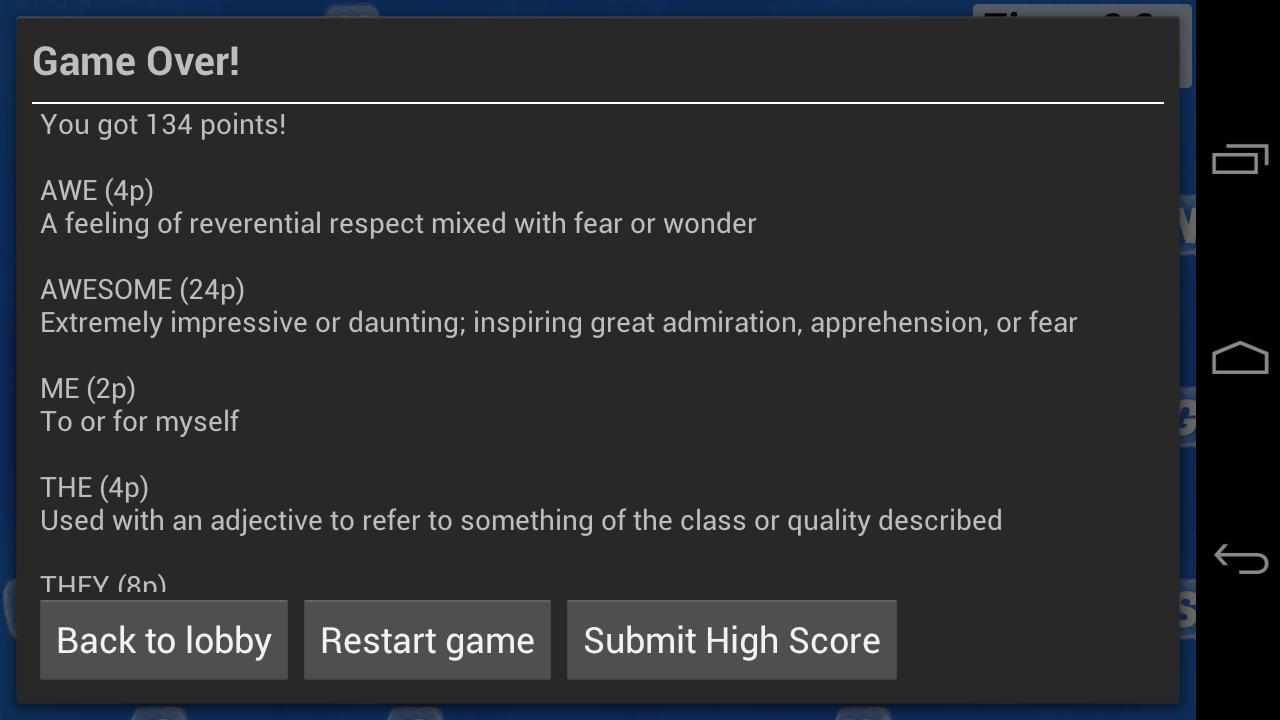 Battle Words هي لعبة كلمة مصممة لإثراء المفردات الخاصة بك! أنت تحرك الطوب لتشكيل الكلمات. كلما طالت الكلمة ، زاد عدد النقاط التي ستكسبها. لكن لا تقم بديلي ديالي ، فأنت لا تملك سوى قدر محدود من الوقت لكل جولة. في نهاية الجولة ، يتم تقديمها بالطبع مع تعريفات الكلمات التي تم العثور عليها.