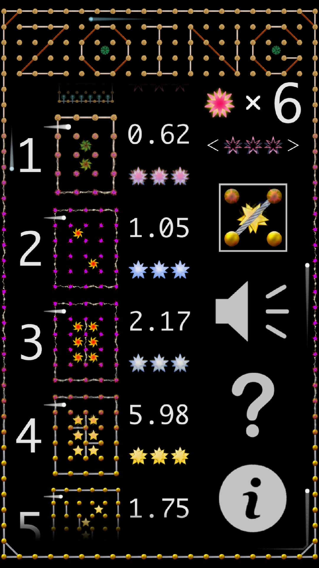 Zoing هي لعبة بسيطة حيث تقوم بتوجيه الكرات إلى الأهداف على السبورة من خلال كذابها قطريًا. يجب عليك تحقيق جميع الأهداف في غضون حد محدد. تبدأ المستويات المبكرة بسيطة ، ولكن في وقت لاحق تصبح أكثر تعقيدًا.