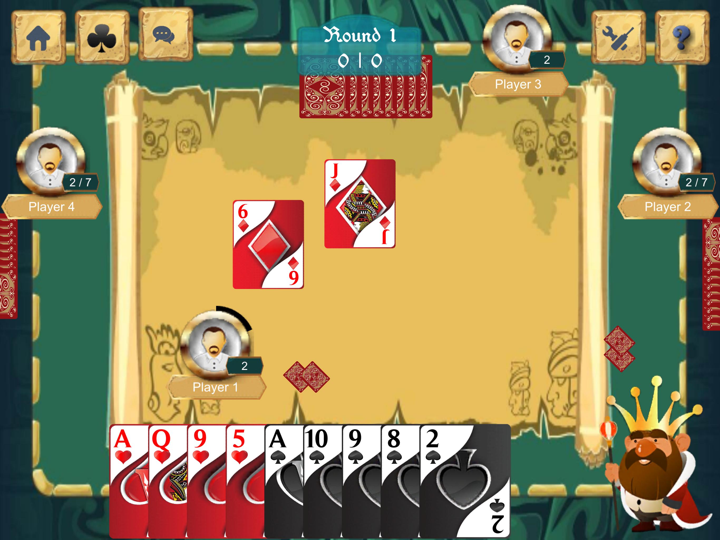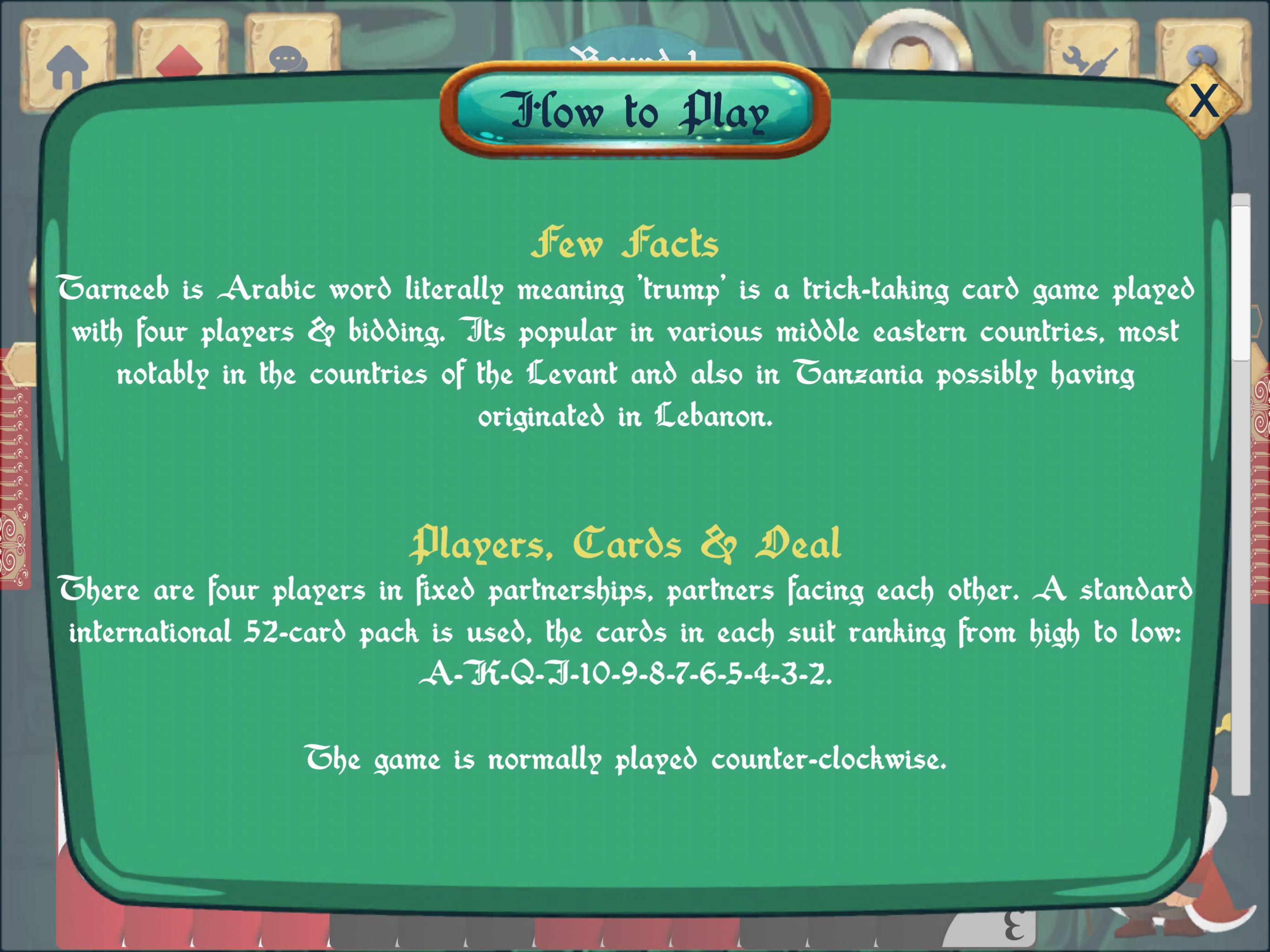 قم بتشغيل بطاقات الشرق الأوسط الكلاسيكية لعبة Tarneeb (Arabic: طrnieb) عبر الإنترنت مع قاعدة المستخدمين لدينا أو في وضع عدم الاتصال مع الذكاء الاصطناعي.