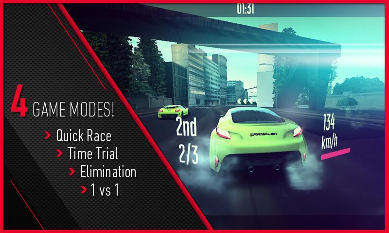 • 4 أوضاع ألعاب حصرية: سباق سريع ، تجربة زمنية ، إلغاء ، PVSP