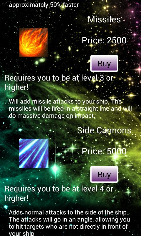 معركة من خلال موجات السفن الغريبة أثناء جمع الأموال لترقية سفينة الفضاء الخاصة بك. يحتوي كل مستوى على مدرب فريد من نوعه يتمتع بقدرات خاصة أو أكثر. شراء ترقيات في المحطة الفضائية بين المستويات لزيادة قوة السفن الخاصة بك.