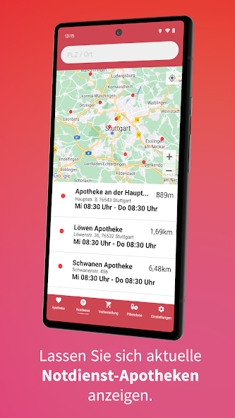 - Verwenden Sie die Rettungssuche in der Apotheke, um die nächste Notfallapotheke in Deutschland zu finden.