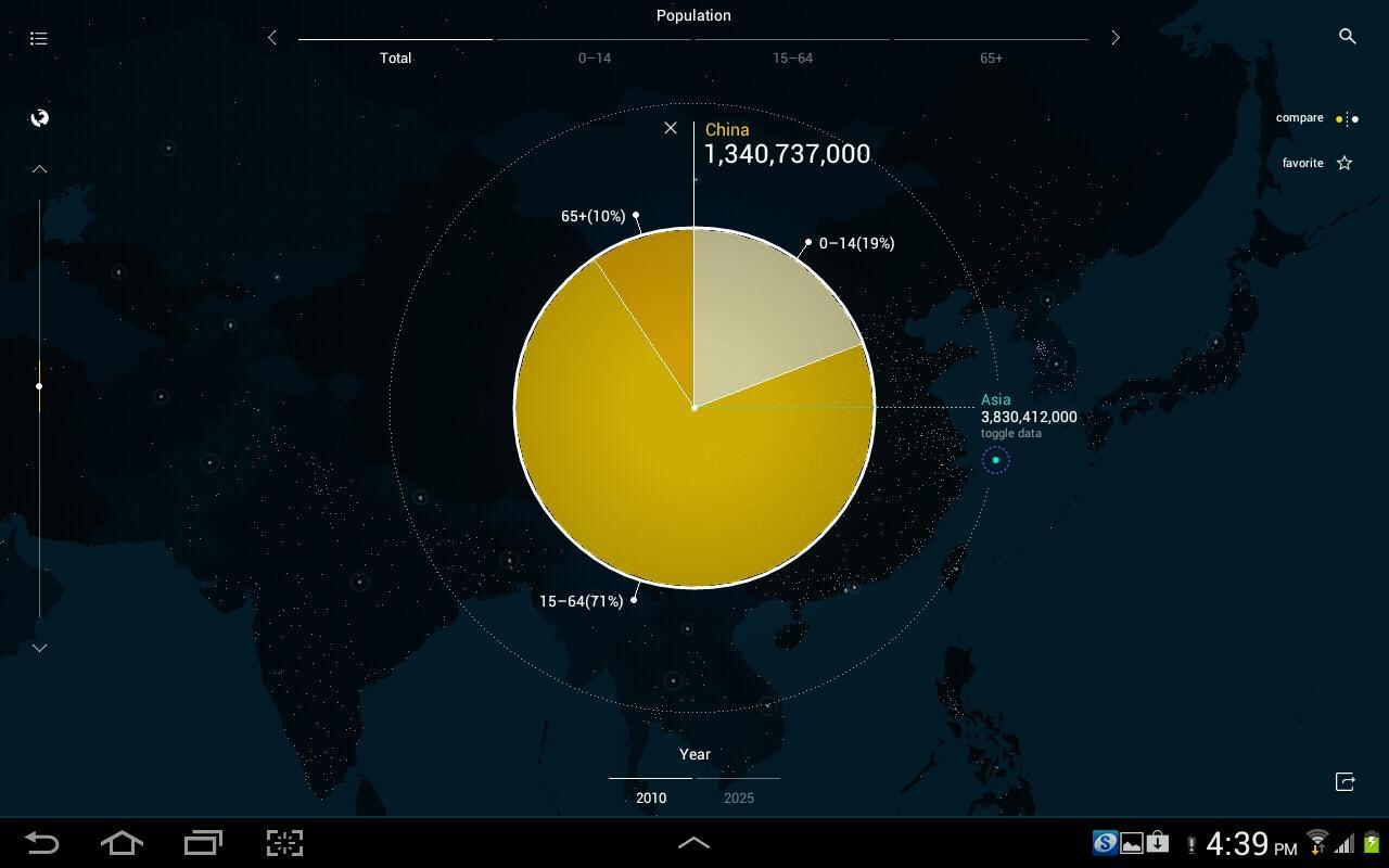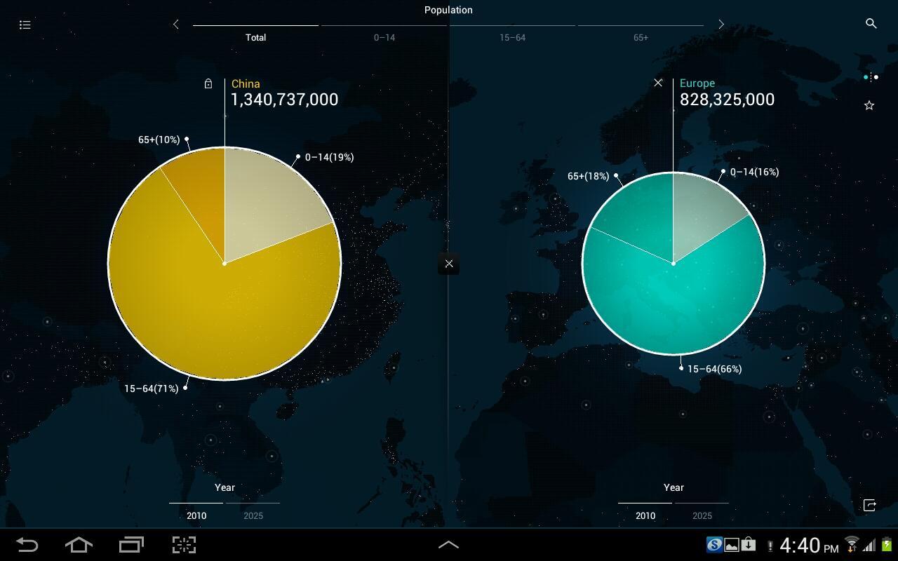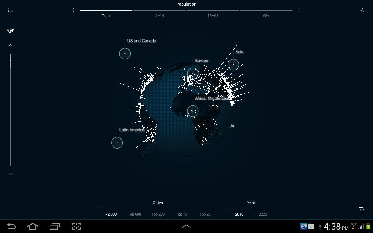 • Drehen Sie den Globus und kneifen Sie, um einzelne Länder und Städte zu vergrößern und ihre Bevölkerung, das Haushaltseinkommen oder das BIP nebeneinander zu vergleichen.