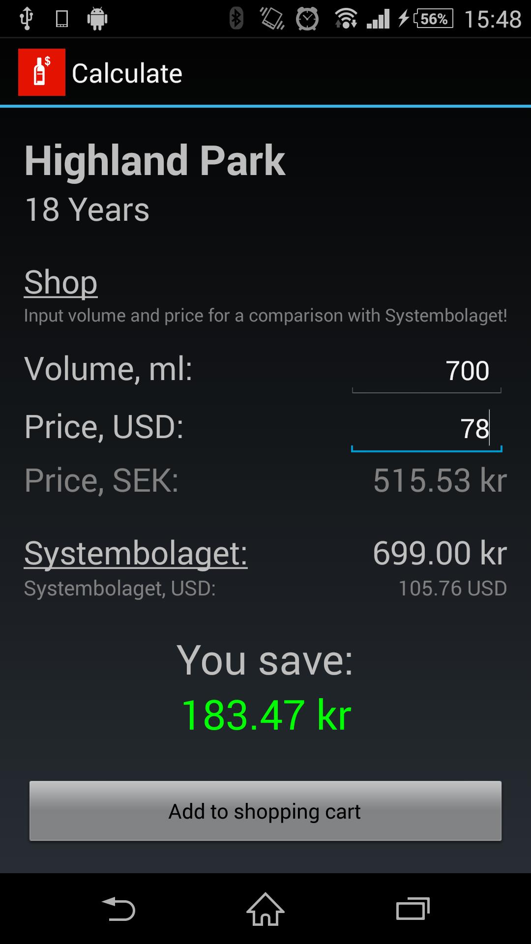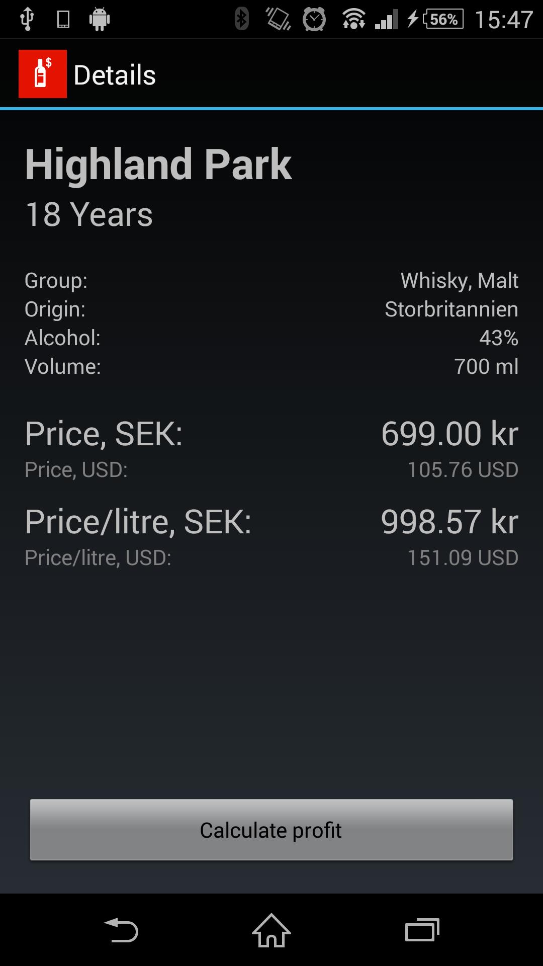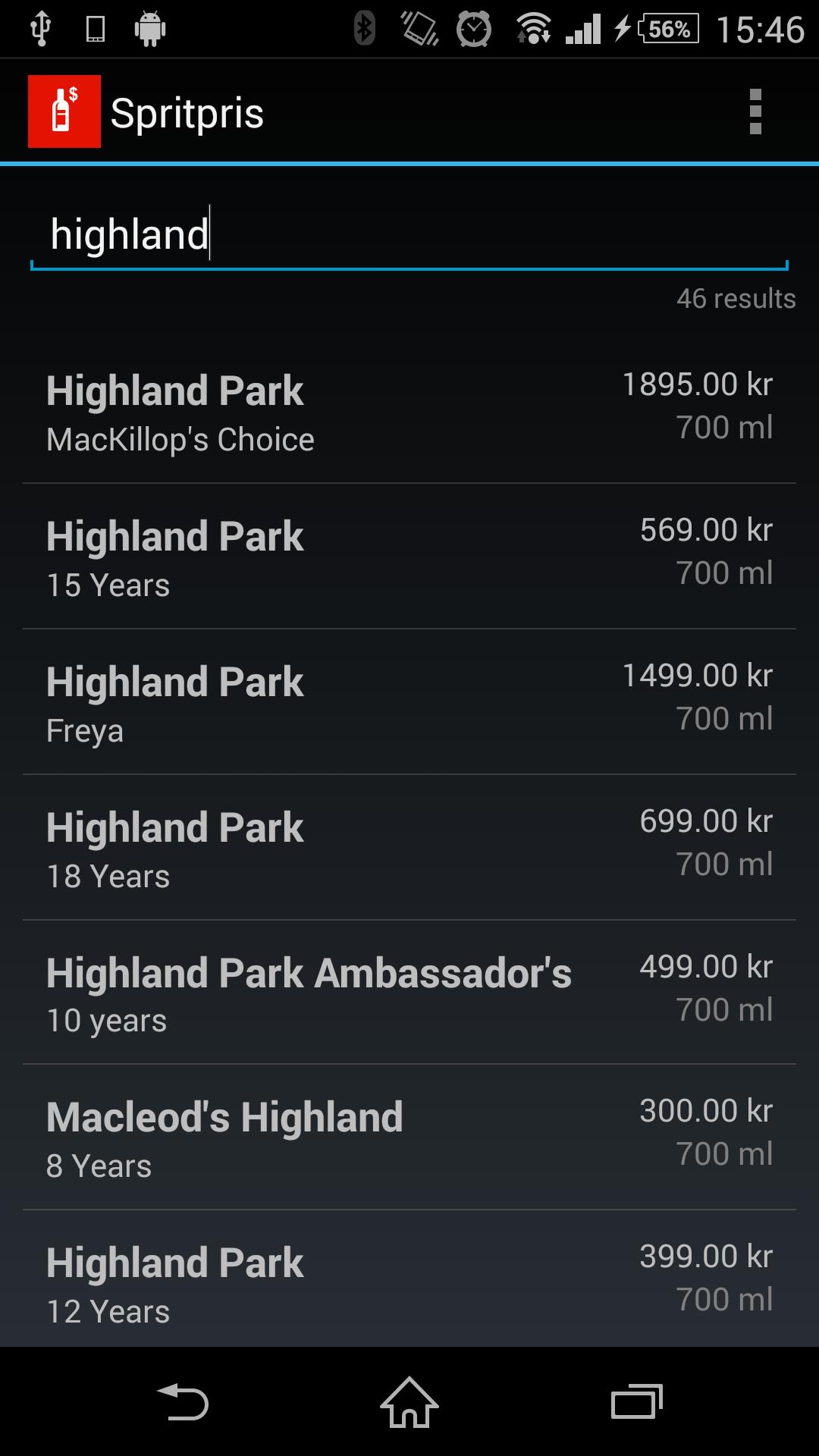 Suchen Sie die Datenbank von SystemBolaget (Swedish State Monopoly Liquor Store). Sehen Sie sich die Preise an, vergleichen Sie es mit jeder Fremdwährung und erstellen Sie Ihren eigenen Einkaufswagen. Perfekt zum Preisvergleich im steuerfreien Laden. Suchvorgänge werden gegen eine lokal gespeicherte Kopie der Datenbank durchgeführt, sodass keine Internetverbindung erforderlich ist.