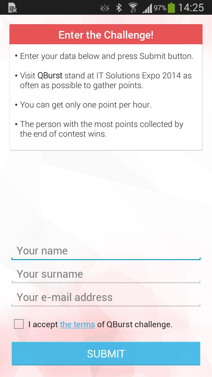 - Sie können die Qburst Challenge eingeben, indem Sie Promo -Punkte sammeln (über IBeacon oder QR Code)