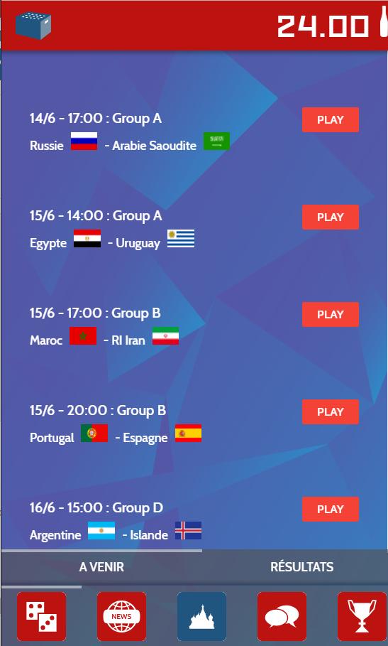 Die Funktionsweise des Spiels ist einfach. Jeder Teilnehmer beginnt mit einem Kredit von einem BAC oder 24 virtuellen Hohlräumen. Diese Tassen können verwendet werden, um auf die Weltcup -Spiele zu wetten, um ein Maximum und - vielleicht - als Teil der seltenen gewählten Beamten zu sein, um die Ehre zu haben, ihren Namen in den Goldenen Tank zu gravieren. Weitere Informationen zur Gewichtung und Berechnung des Einkommens finden Sie im Menü unter dem Abschnitt „Wie es funktioniert“.