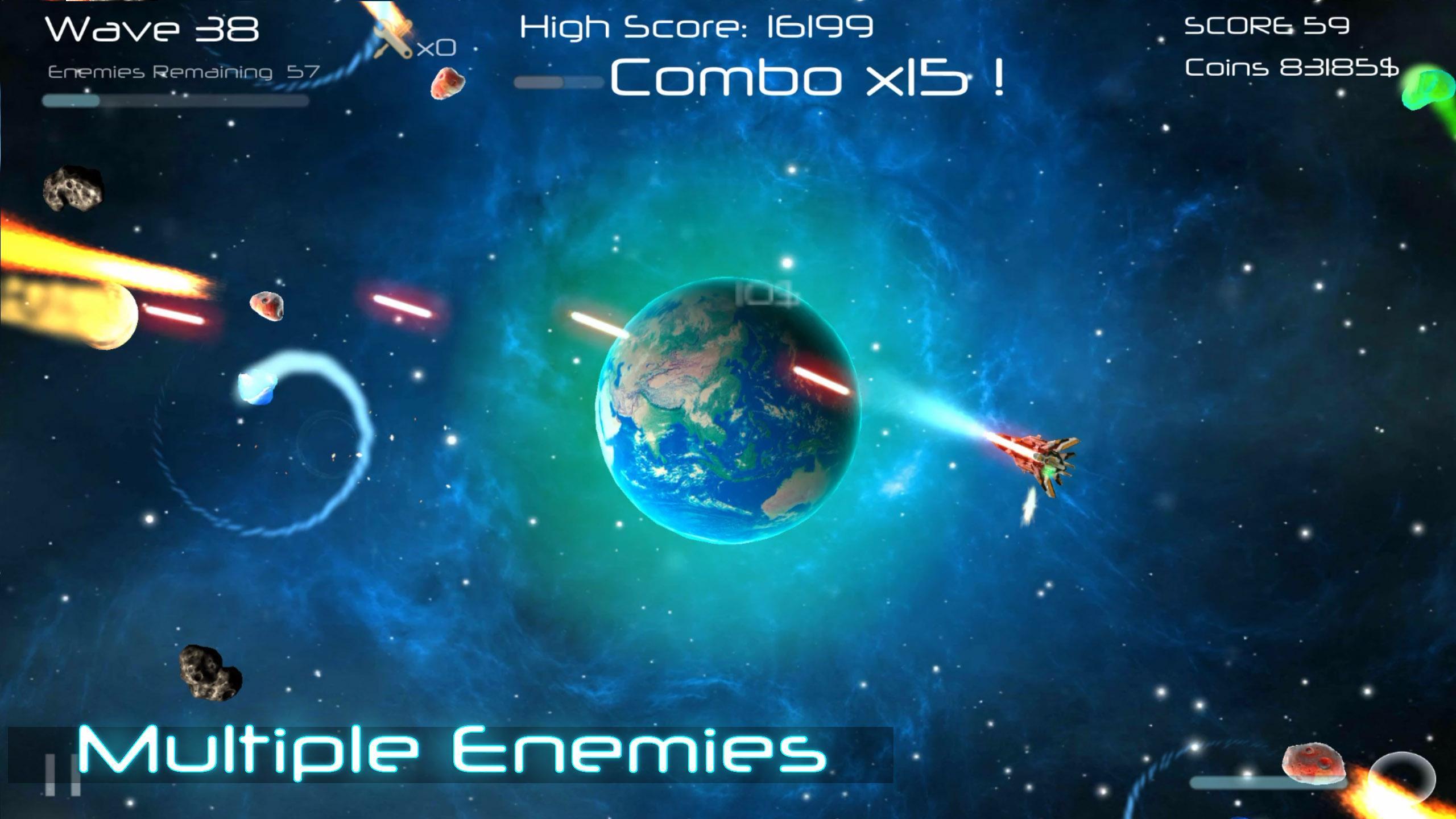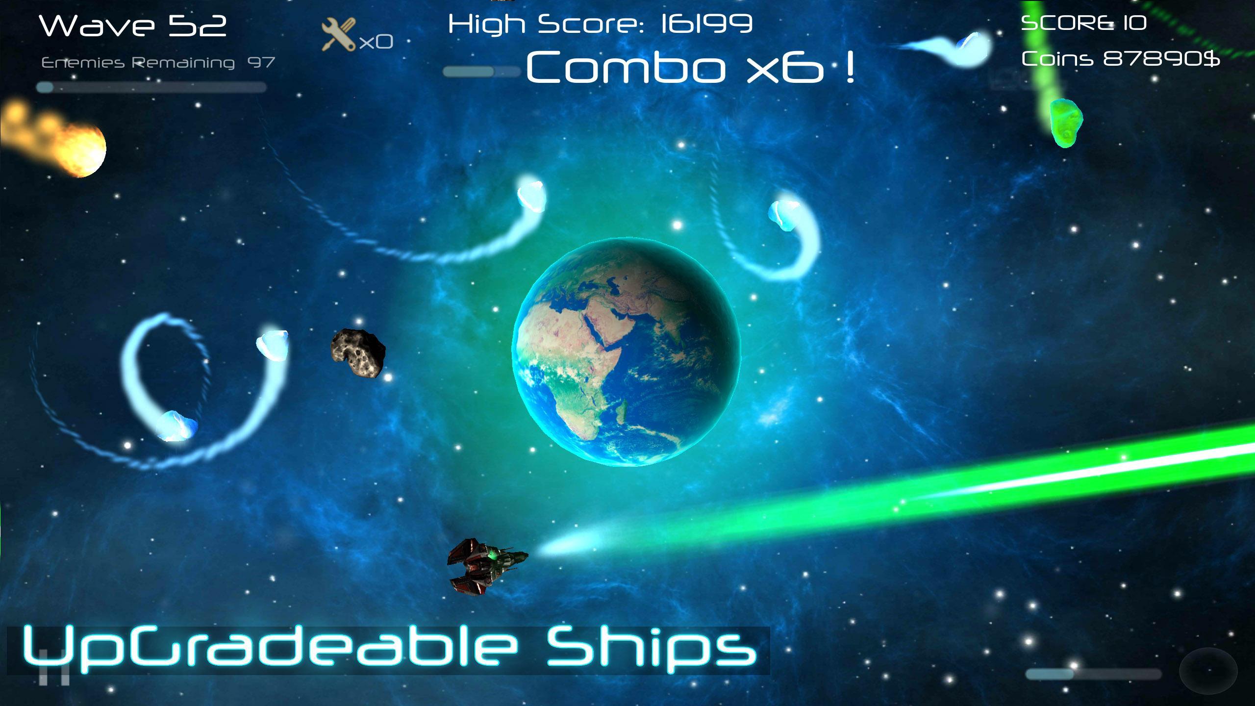 -Pasieren Sie Ihre Schiffe und Waffen, damit Sie Asteroiden wie Süßigkeiten zerstören können.
