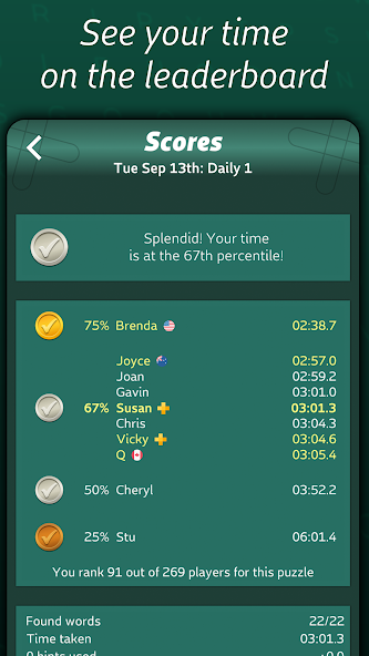 - Kostenloser unbegrenzter Zugang zu unseren täglichen und wöchentlichen Rätseln, jeweils eine eigene Online -High -Score -Tabelle, damit Sie Ihre Zeiten einreichen und sehen können, wie Sie vergleichen!