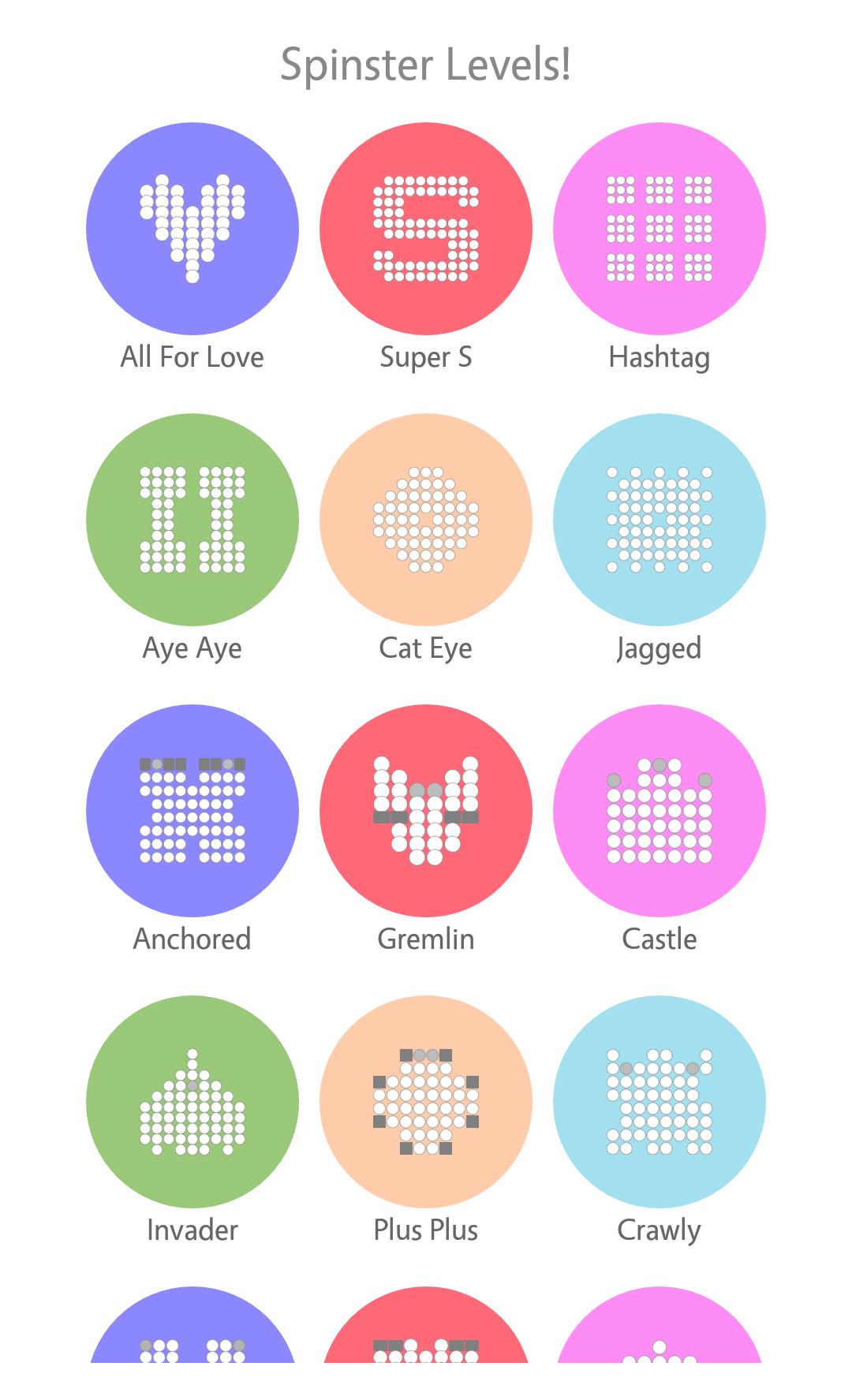 Spinster beinhaltet 48 Levels, die zu schlagen sind, zusammen mit 6 offenen Maßstäben an Timer-basierten Bewegungen und 6 offenen Maßstäben an bewegungsbegrenzter Herausforderung mit Errungenschaften und Bestenlisten für jedes Level!