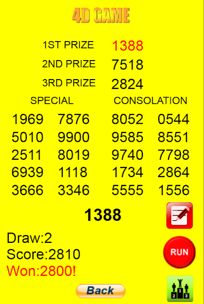 4d Lotteriespiel. Wählen Sie Ihre 4D -Glücksnummer aus und wetten Sie, um eine hohe Punktzahl zu erhalten. Das Spiel generiert eine zufällige 4D -Nummer von 0000 bis 9999 für jede Ziehung. Sie können Ihre Nummer vor der Wette bearbeiten. Senden Sie eine Punktzahl an High Score Board. Wünsche dir viel Glück.