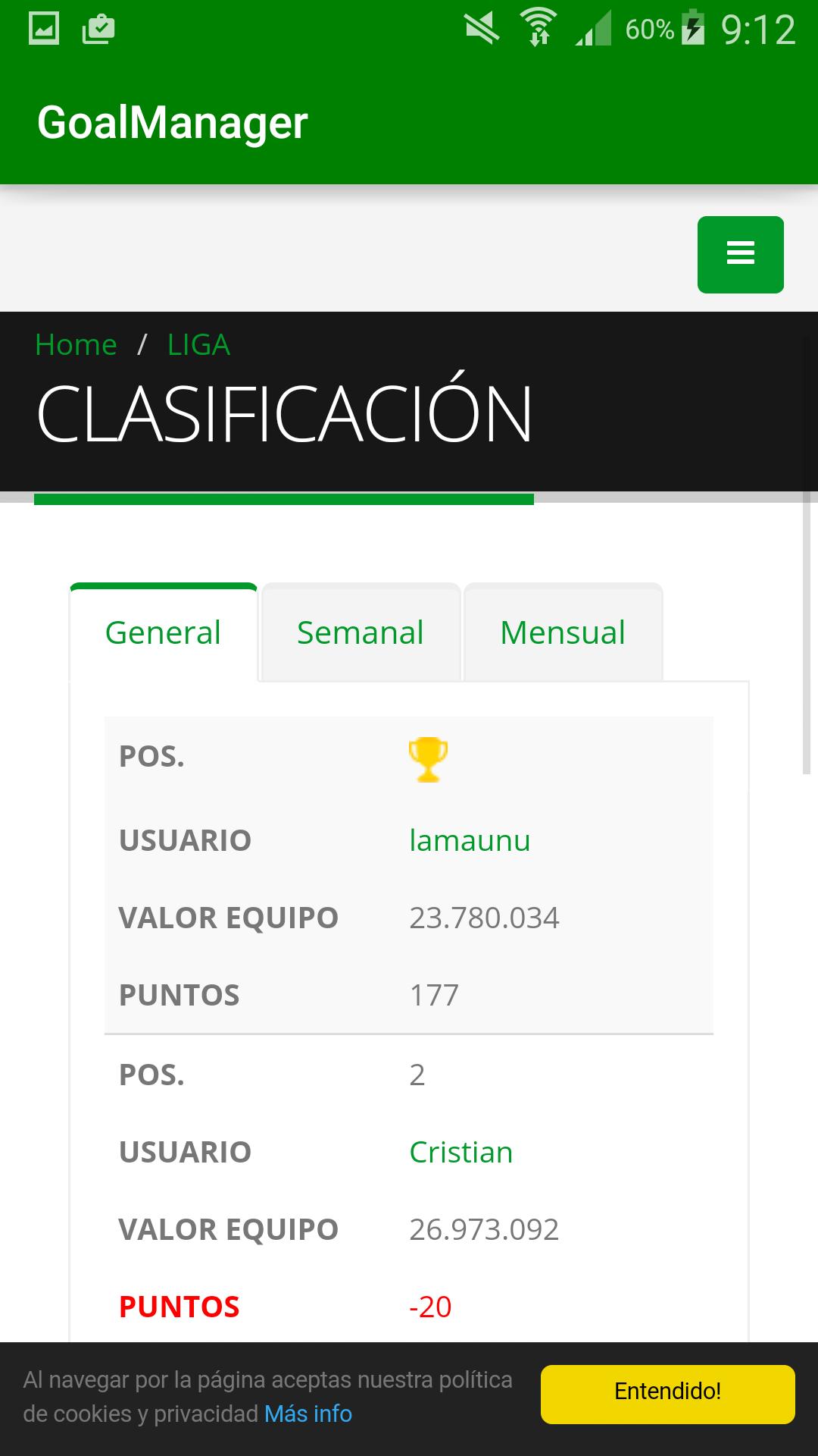 Goal Manager , der Fußballmanager, bei dem die Real Player -Ergebnisse Ihre eigenen Ergebnisse beeinflussen. Beweisen Sie Ihr Fußball und Ihr strategisches Wissen, verwalten Sie Ihr Team und seien Sie die besten in der Rangliste. Fordern Sie Ihre Freunde heraus! Wer wird der letzte sein?