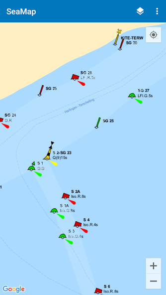 SeaMap muestra información náutica en un mapa. Esto es útil cuando sales a navegar con tu bote. Incluye balizas, boyas, Signi, IALA-A y otras ayudas de navegación.