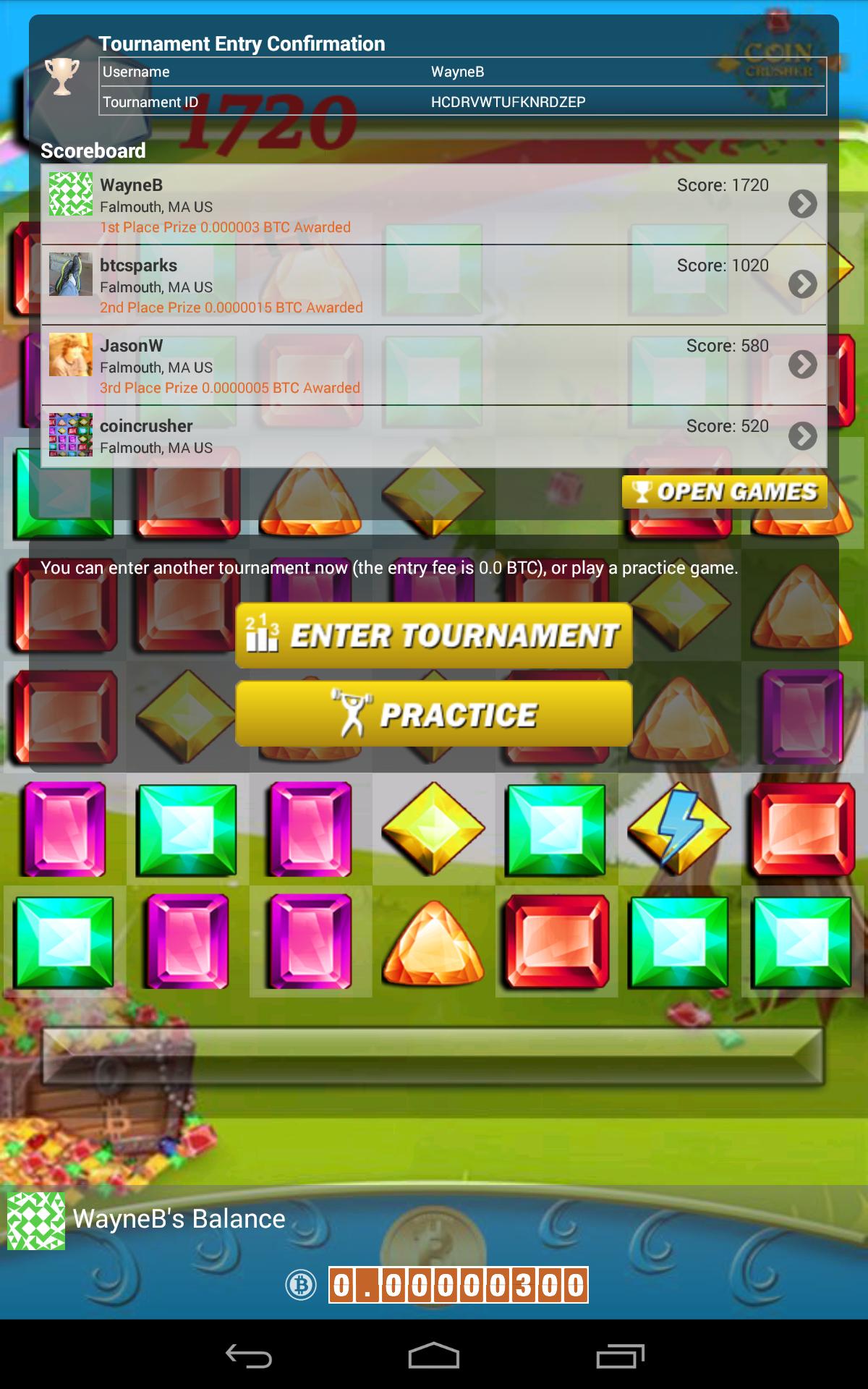 Todos nuestros torneos Bitcoin Crush y competiciones cara a cara son gratuitas. Puede retirar sus ganancias a cualquier billetera de bitcoin que desee en cualquier momento (hay un mínimo de 0.00016 BTC debido a las tarifas de transacción de red de bitcoin).
