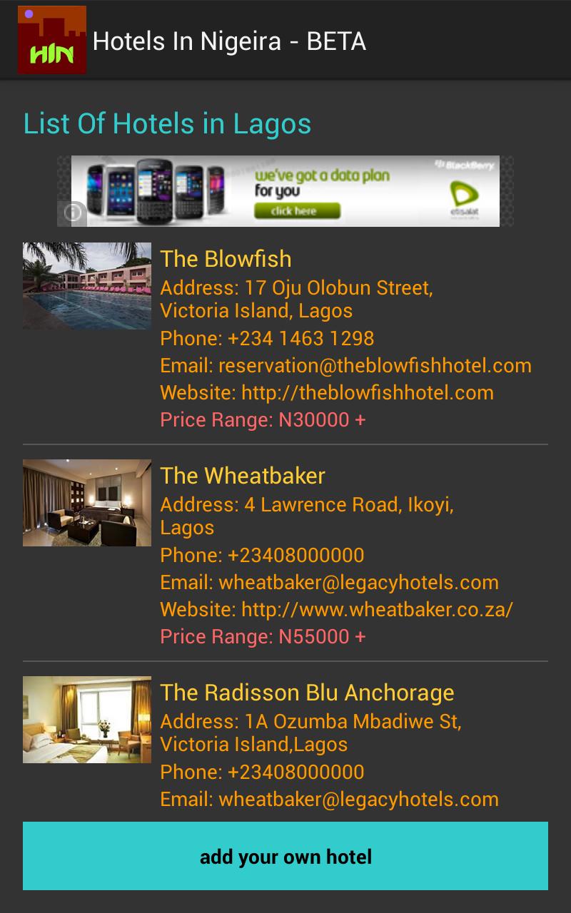 Hotels In Nigeria sont un répertoire d'hôtels, d'ins, de maisons d'hôtes et d'auberges dans les villes et villages nigérians. Il s'agit d'un répertoire évolutif et contient pour le moment une liste des hôtels dans certaines des grandes villes nigérianes. Cette liste se développe constamment et est mise à jour. Il contient tous les hôtels pour tout budget, de 5 étoiles au budget de bustring.