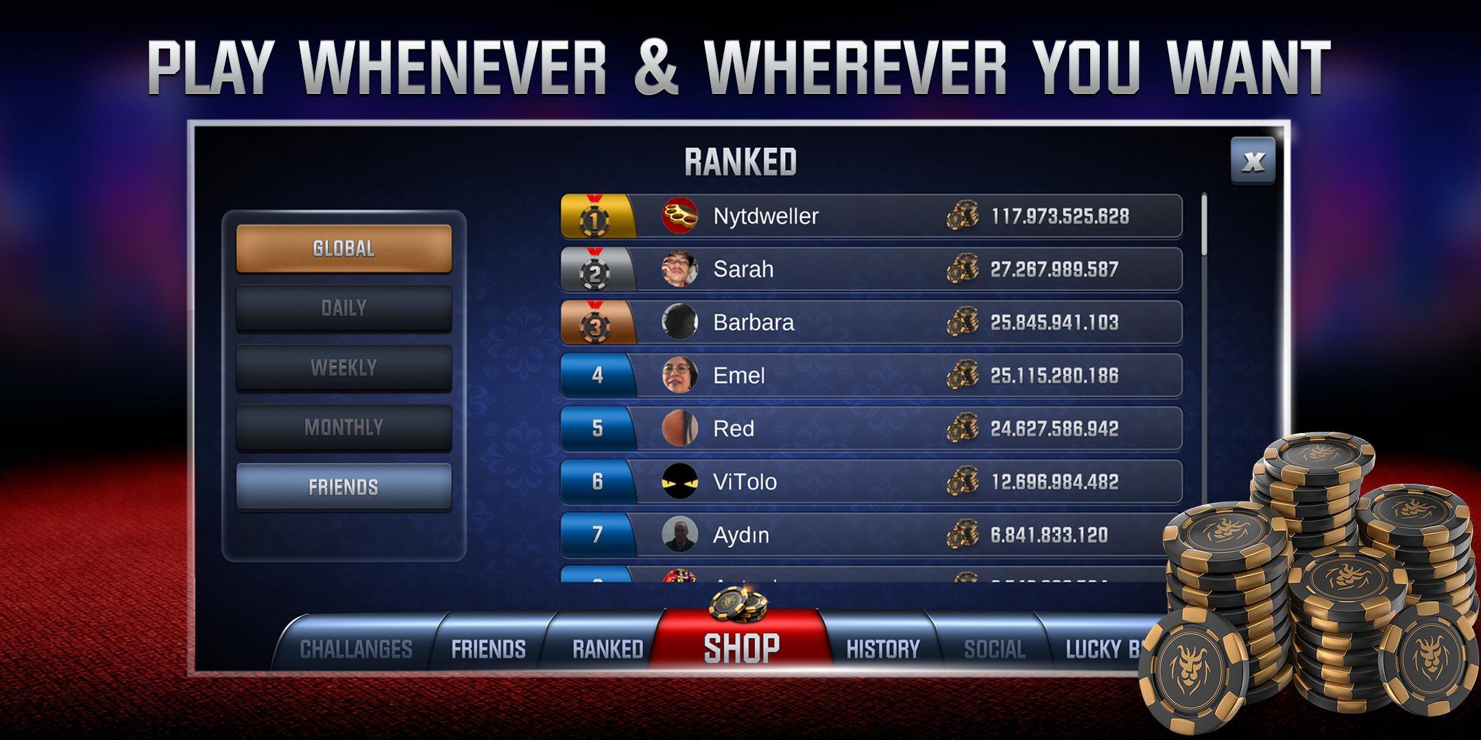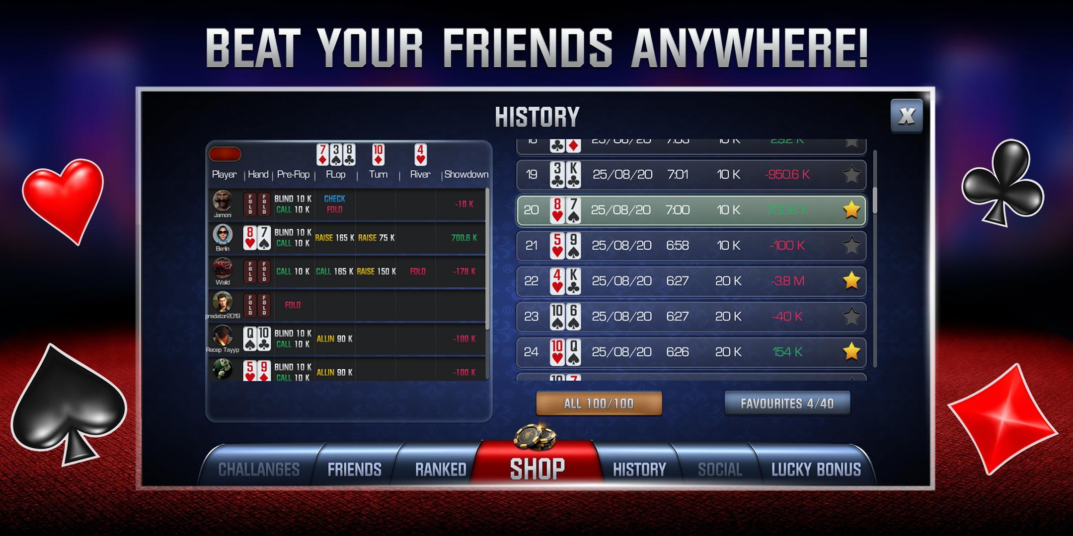 • Tournois - maîtriser vos compétences de poker et acquérir l'expérience 3 fois par jour par jour! Participez à un tournoi spécial mensuel où vous pouvez gagner beaucoup de jetons et en tête de liste des meilleurs joueurs!