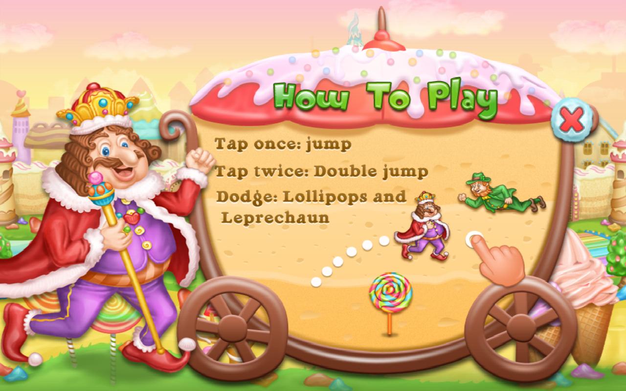 Collect heart shaped lollypops to gain lives as you use touch gestures to guide yourself across the map. Tap once to do a jump and twice for a double jump. You will need to do this to dodge obstacles like bad lollypops, leprechauns and giant pits. When you die, you will re-spawn if you have any lives left.