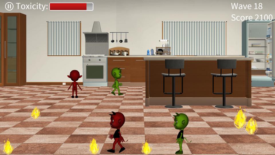 The main idea is simple, these spooky little devils have a bad sulfur smell and they want to set your home on fire, yes they want to burn your house down! Thankfully, they hate holy water so all you need to do is to take that and shoot them with it before you get overrun by them. Do not forget to put out all the fires; the fire smoke and the sulfur smell increases the toxicity on the room and it will take you down.