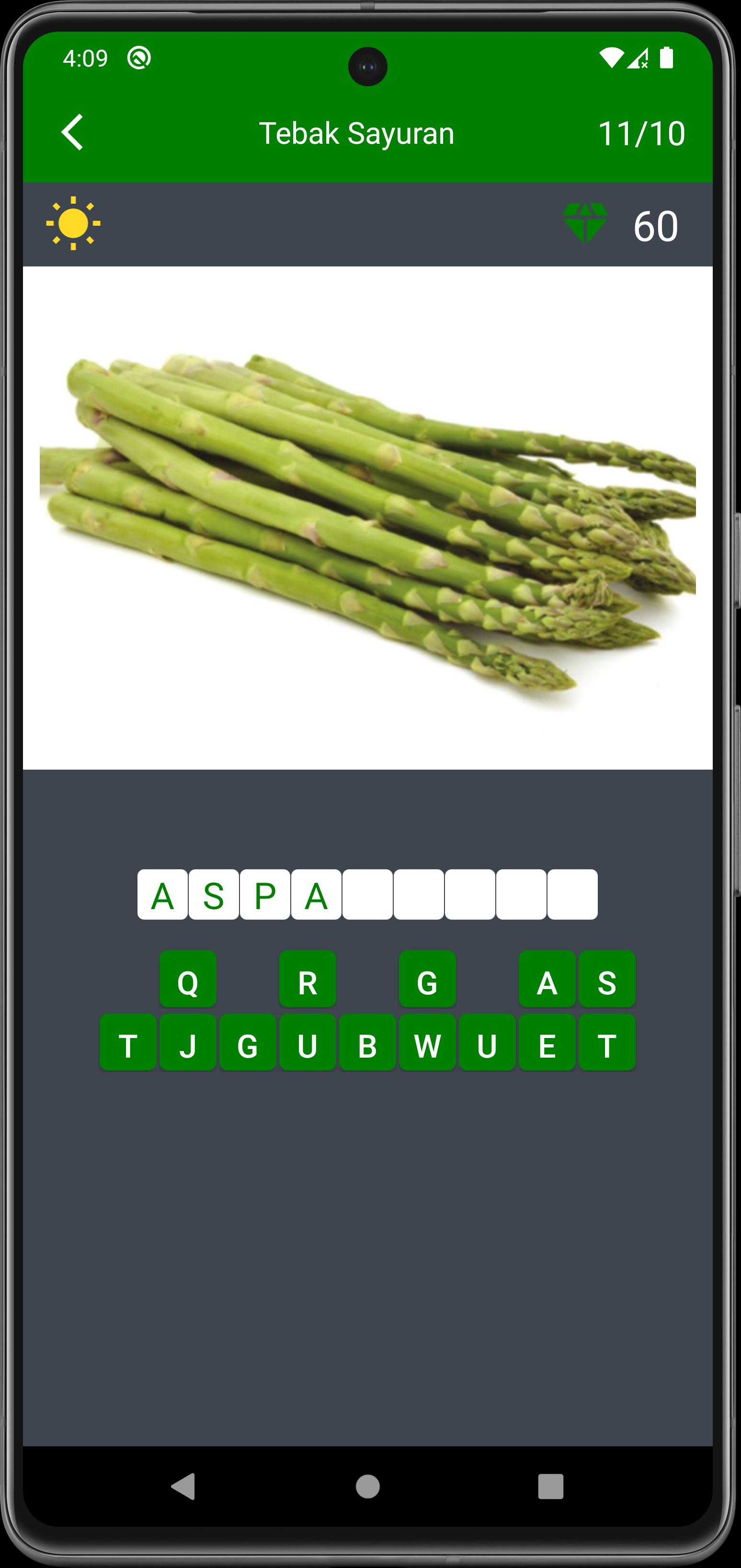 In this game you are asked to guess the type of vegetable that appears to right, the word that we embed only one answer, for example, the image that appears is "chili", then your answer must also be "chili", should not be "chili", we intentionally made the game as such, so as not to get bored when you play it.