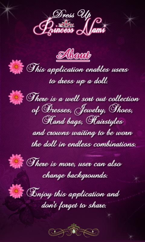 This application enables users to dress up a doll. There is a well sort out collection of dresses, Jewelry, Shoes, Hand bags, Hairstyles and crowns waiting to be worn by the doll in endless combinations.