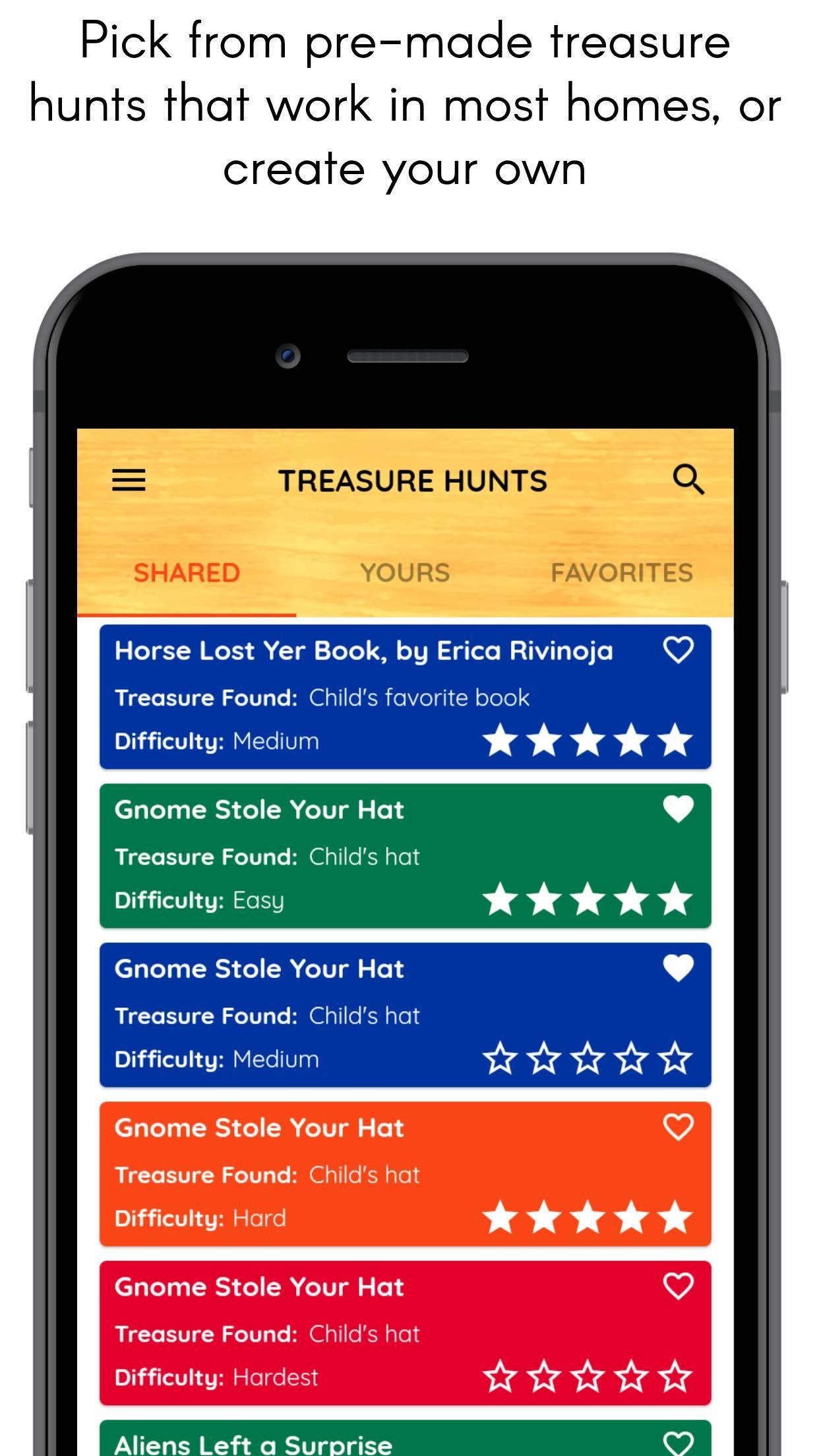 Parents can design their own treasure hunts, customizing them for their children and their house, or draw from a database of treasure hunts with pre-made clues that will fit most homes.