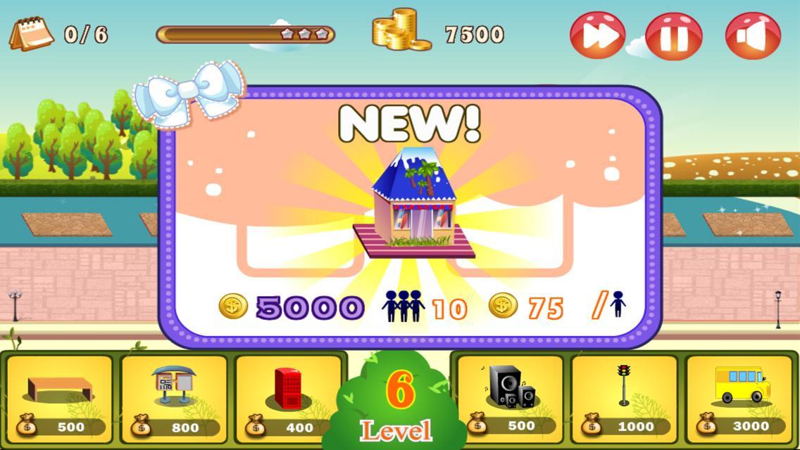 In Shopping Street, your task is to beautify the shopping area of your little town with chic stores, restaurants and boutiques. You start with a small bistro which offers only a few seats and yields little profit. When you fulfill the objectives provided, you get a higher budget in later levels, and more and more exclusive shops become available to you.