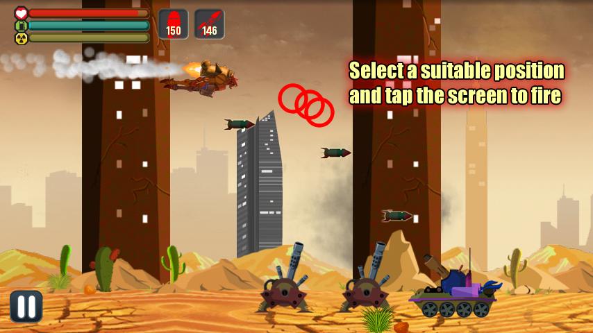 When flying and full of ammunition you are free to fire by taping the screen.