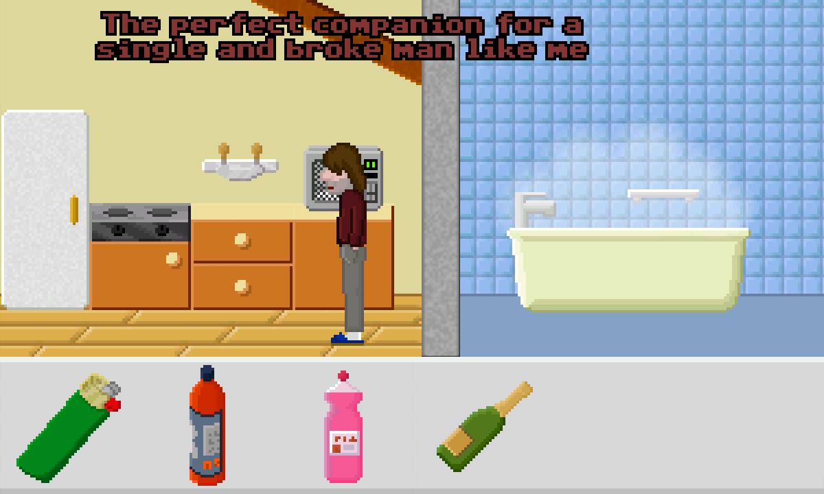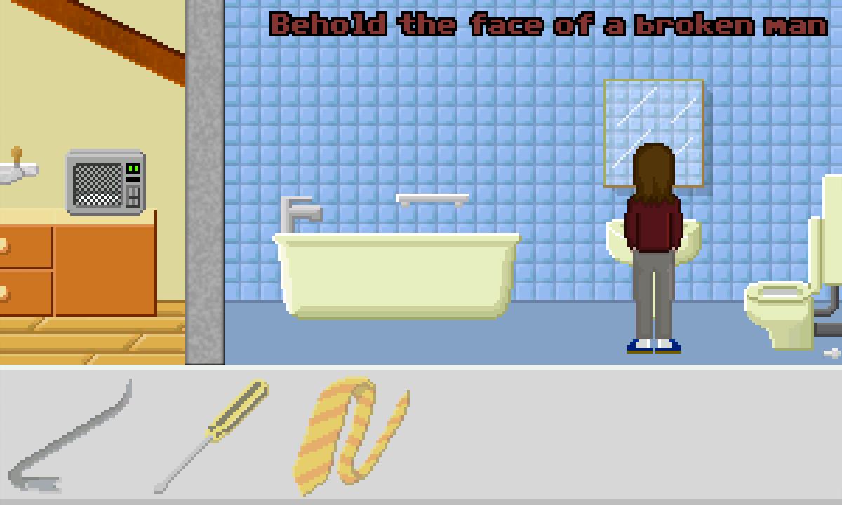 Find all the different ways to relieve the poor protagonist of his miserable existence: pick up, use and combine objects to unlock all 18 awards.