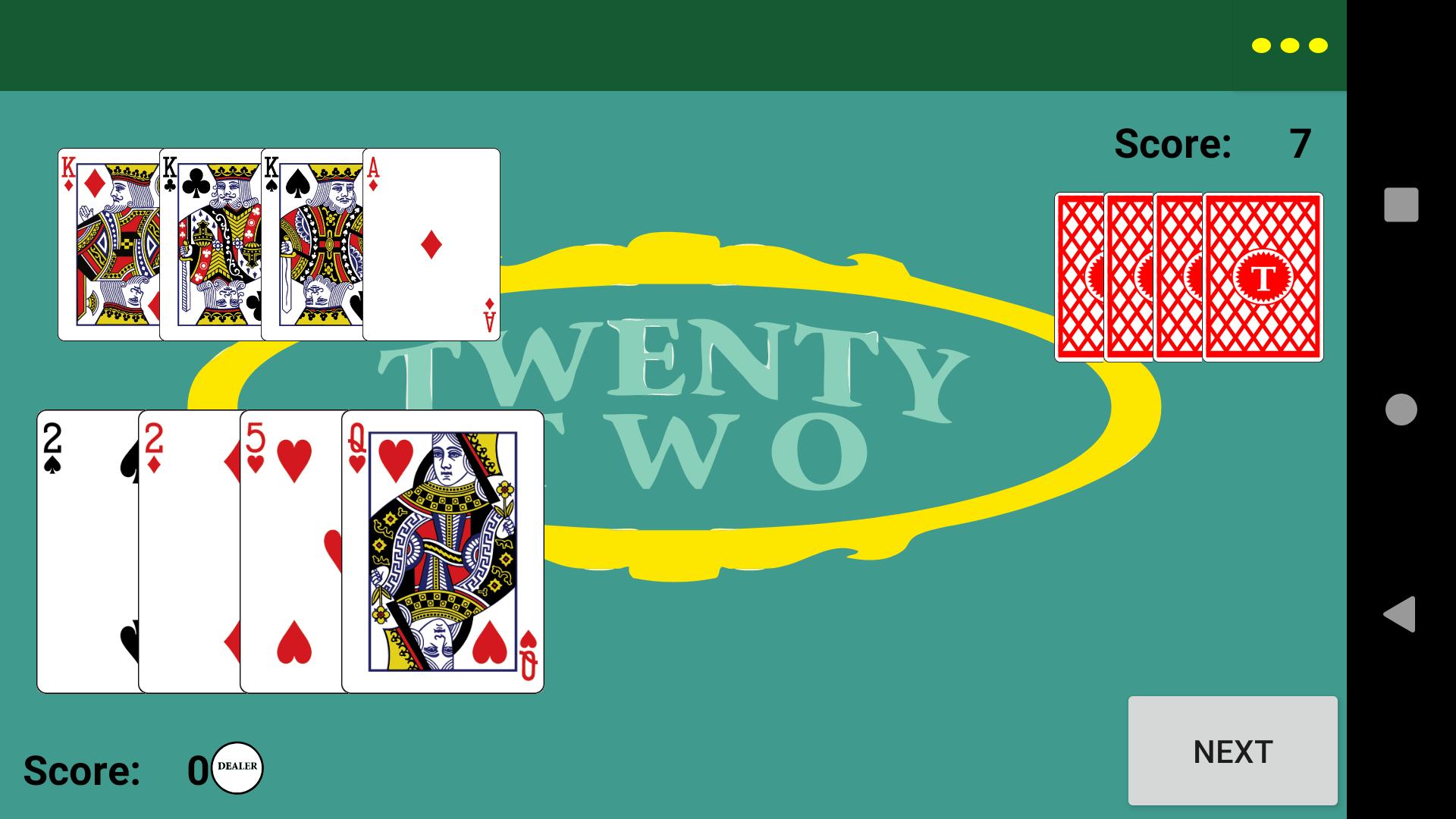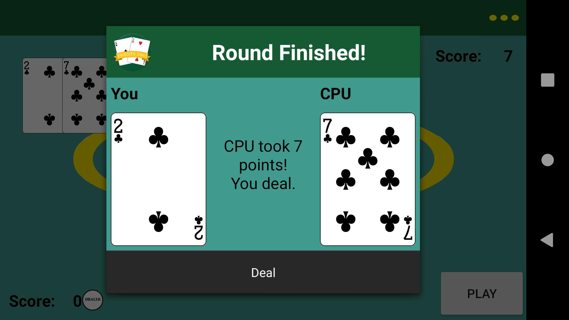 Twenty Two is a trick-taking card game based off the popular Northern European game "Cucumber.". The object is to NOT take the last trick. When playing cards, players must take the trick by matching or beating the lead card's value. If a player cannot take the trick, she/he must play their lowest valued card.