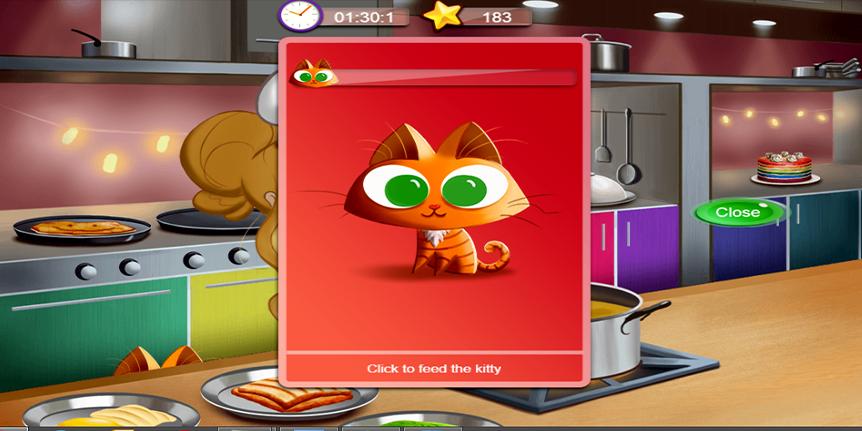 Tasks: Cake decoration, cat feeding, sandwiches and also making pancakes. When '!' Visually, stop playing until your boss comes out.