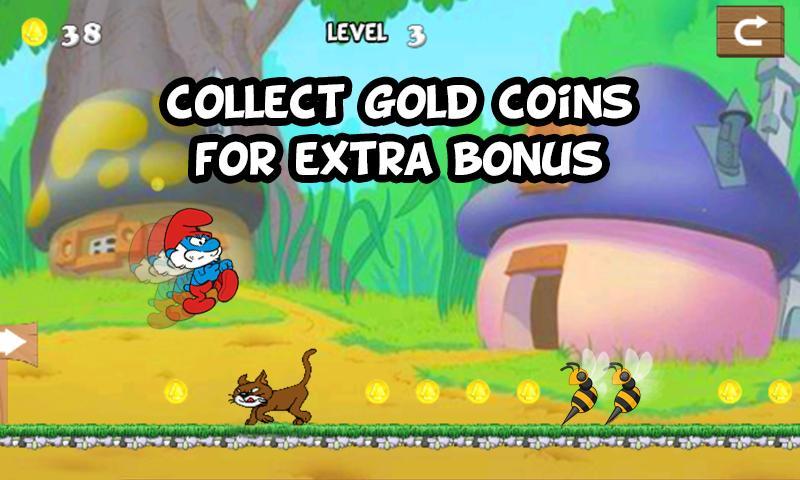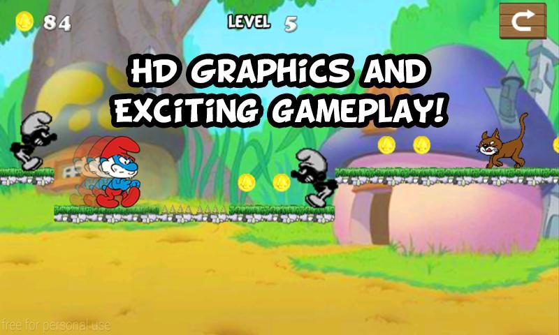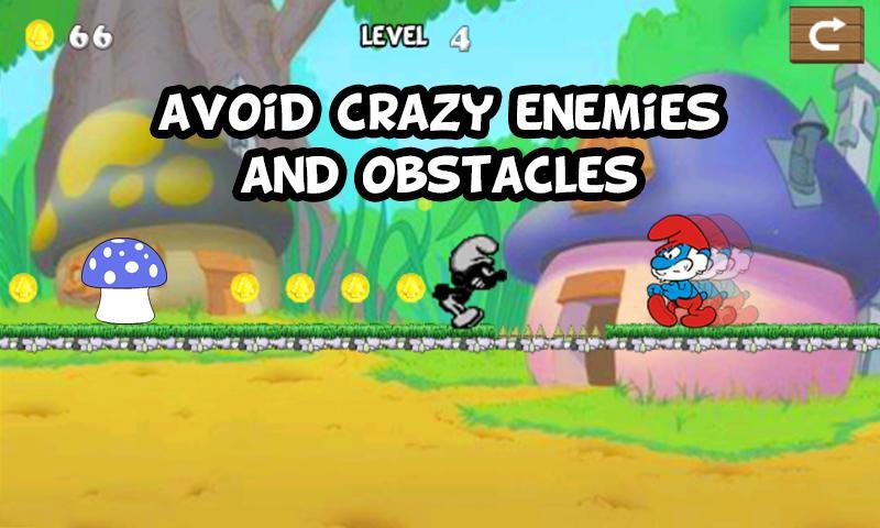 The beloved Gran papa has been bully by the super villain Doctor Joker Jake. He need help to escape the evil army of Doctor Joker Jake. Doctor Joker Jake has made a mess in the smurflings village, every smurflings has turned dark and evil! Assist gran papa to run out of the city before he got caught and jailed. Be apart of the best FREE RUNNING GAME in 2015 !!!