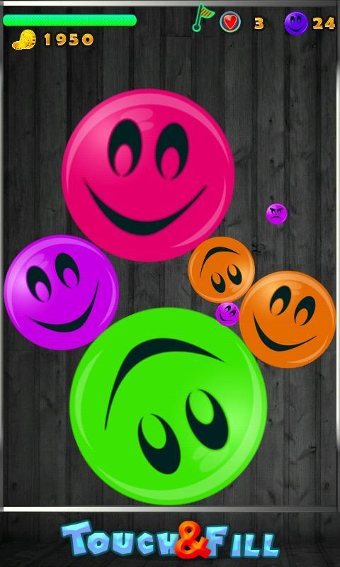 Game objective is to fill the 65% of the game area with the colorful smilies.Keep touching the screen to increase the size of smiley,while its size is increasing avoid colliding with the moving smilies.