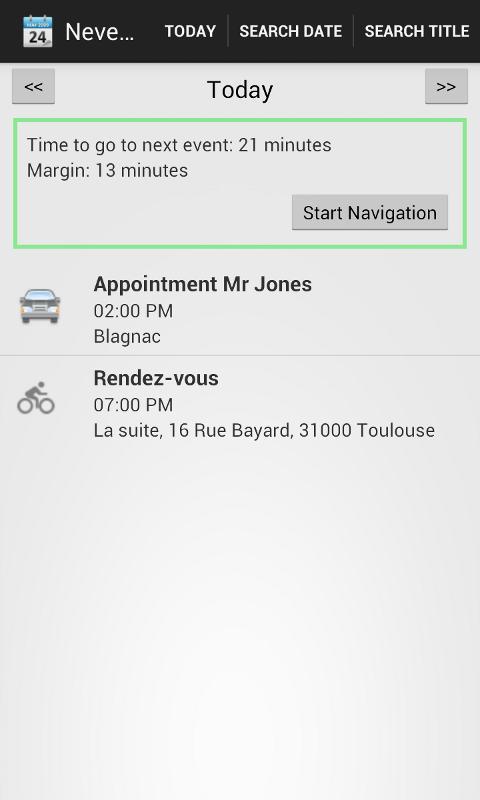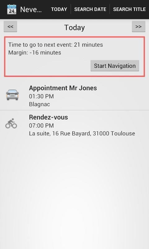 " Never Late " adalah aplikasi yang sangat sederhana yang memeriksa acara kalender Anda, ambil yang berikutnya dan katakan berapa lama Anda sebelum pergi. Ini juga termasuk tombol "Mulai Navigasi" yang cepat memulai Google Maps dengan alamat yang tepat dan mode transportasi.