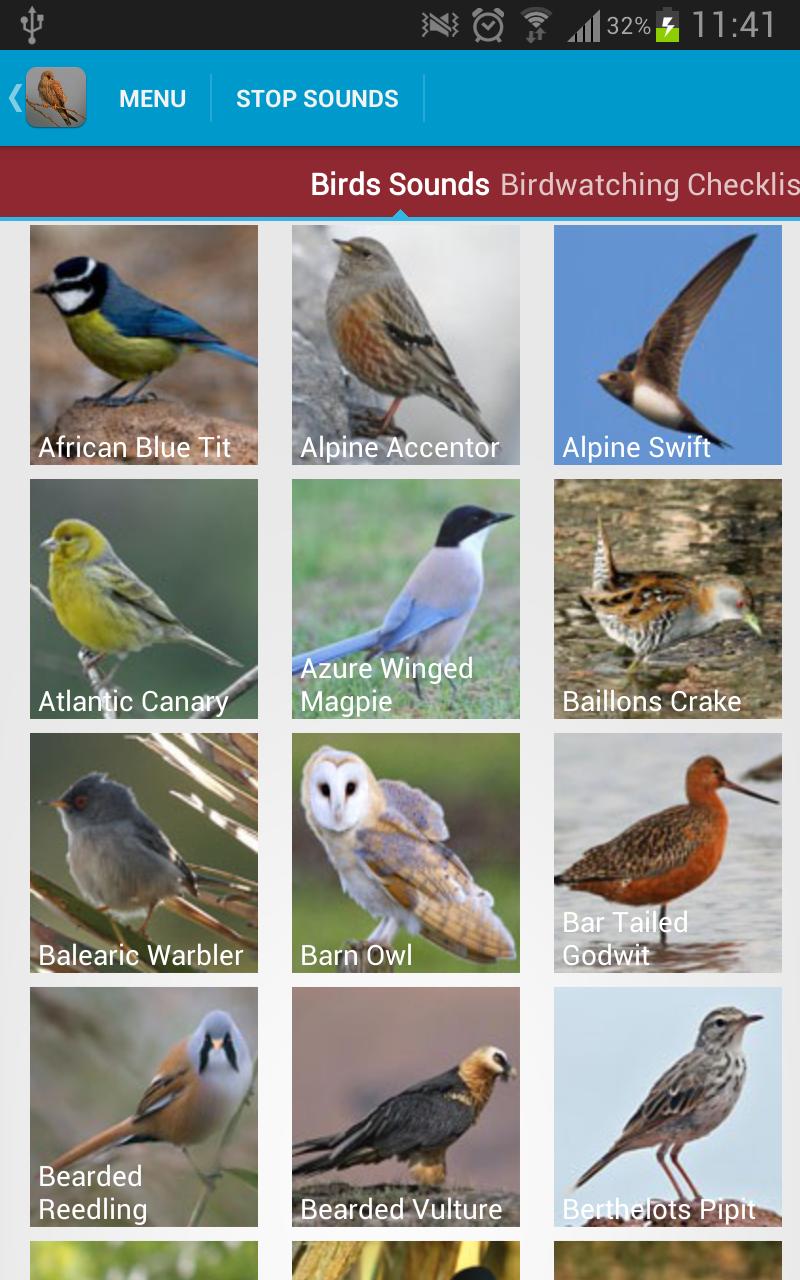 Suara burung dapat dimainkan dengan mengetuk gambar burung. Semua suara dapat disimpan sebagai nada dering, pemberitahuan dan alarm dengan lama menekan burung dan memilih opsi yang relevan.