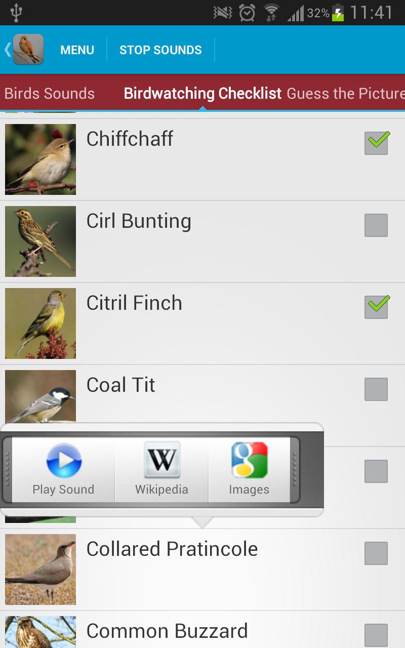 Daftar periksa yang mengamati burung termasuk memungkinkan Anda untuk menandai burung yang telah Anda lihat. Mengetuk pada layar Burung di Daftar Periksa memungkinkan Anda untuk melihat lebih banyak informasi tentang burung di Wikipedia atau melakukan pencarian gambar melalui gambar Google.