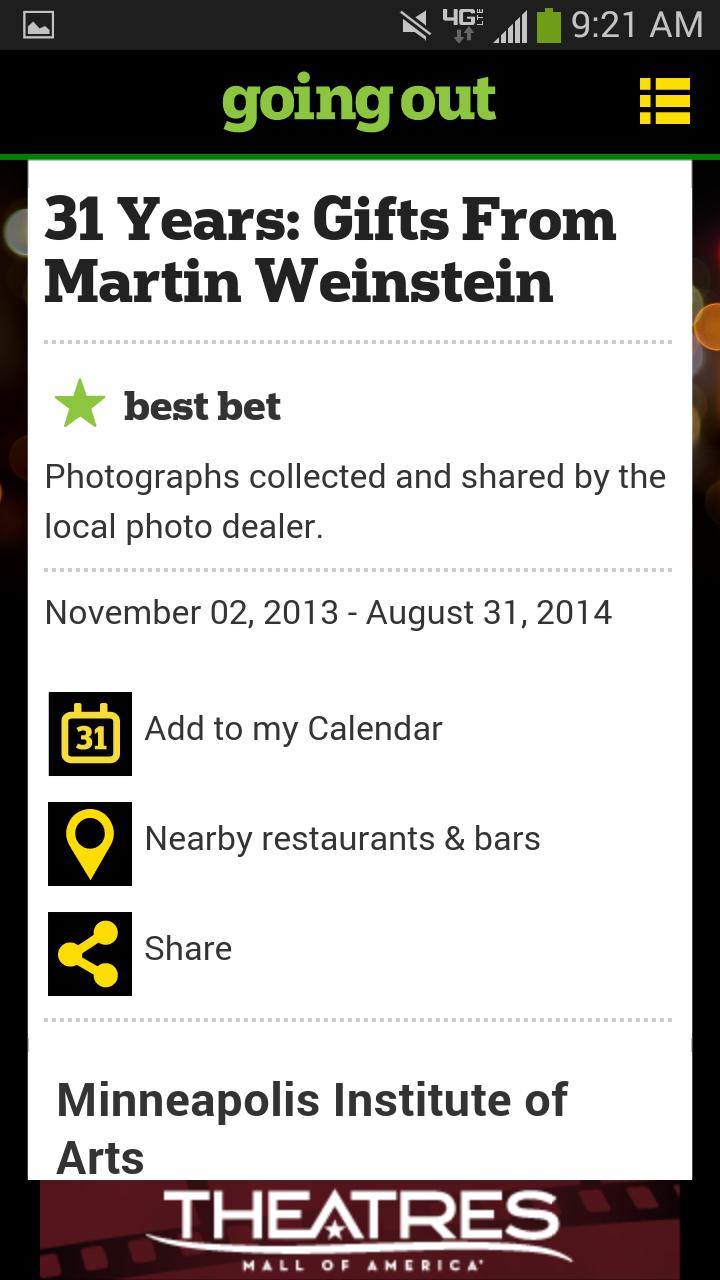 Mencari panduan utama untuk apa yang terjadi di Minneapolis/Saint Paul? Dari kehidupan malam terpanas hingga atraksi yang ramah keluarga, aplikasi Going Out dari Star Tribune adalah solusi Anda yang cepat dan mudah, satu atap untuk menemukan, merencanakan, dan memesan yang terbaik di Kota Kembar, hiburan dan kegiatan metro-area. Menampilkan ulasan mendalam dan panduan acara dari para ahli lokal Minnesota, bersama dengan rekomendasi tepat waktu dari restoran lokal, drama, konser, film, klub dan banyak lagi, aplikasi Going Out adalah semua yang Anda butuhkan untuk mencari tahu ke mana harus pergi dan apa yang harus dilakukan-apakah ini hari ini, malam ini, besok atau akhir pekan ini.