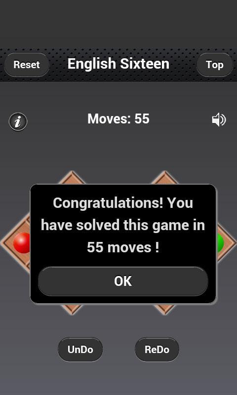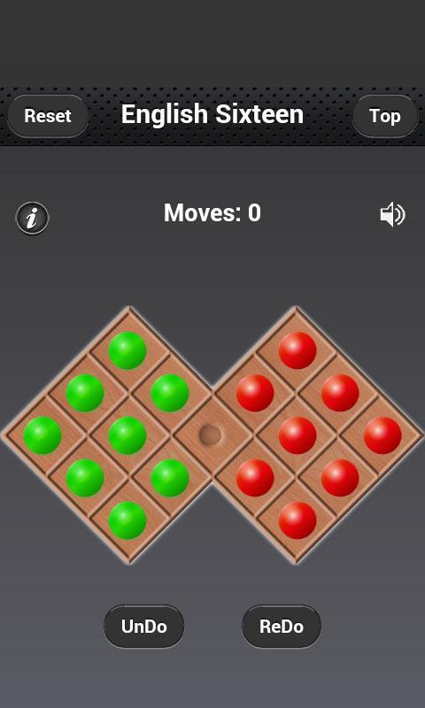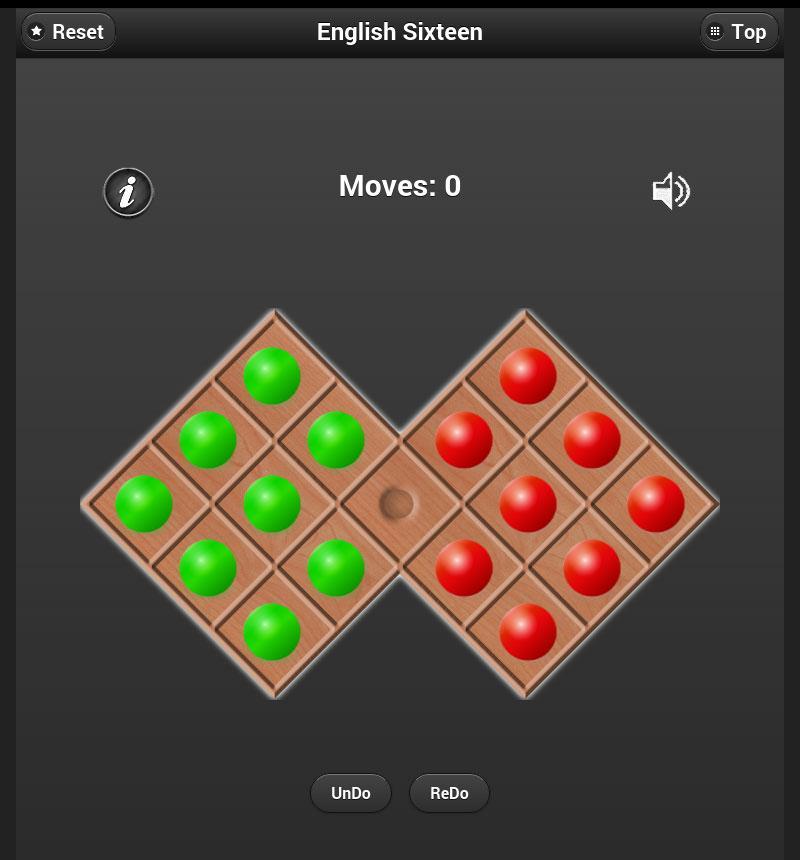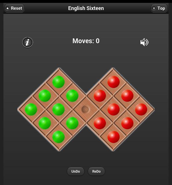 Ini adalah teka -teki yang menyenangkan yang awalnya dirancang oleh seorang pelaut Inggris. Objek teka -teki adalah untuk mengubah posisi potongan merah dan hijau dalam jumlah gerakan paling sedikit. Ketuk sepotong untuk memindahkannya ke kotak kosong di papan tulis. Sepotong dapat dipindahkan ke kotak kosong yang berdekatan, atau melompati bagian yang berdekatan (dari kedua warna) ke kotak kosong. Tidak ada gerakan atau lompatan diagonal yang diizinkan. Daftar teka -teki pakar Inggris menemukan solusi tercepat yang diketahui, hanya terdiri dari 46 gerakan. Bisakah Anda mendekat atau bahkan menemukan solusi 46 Move?
