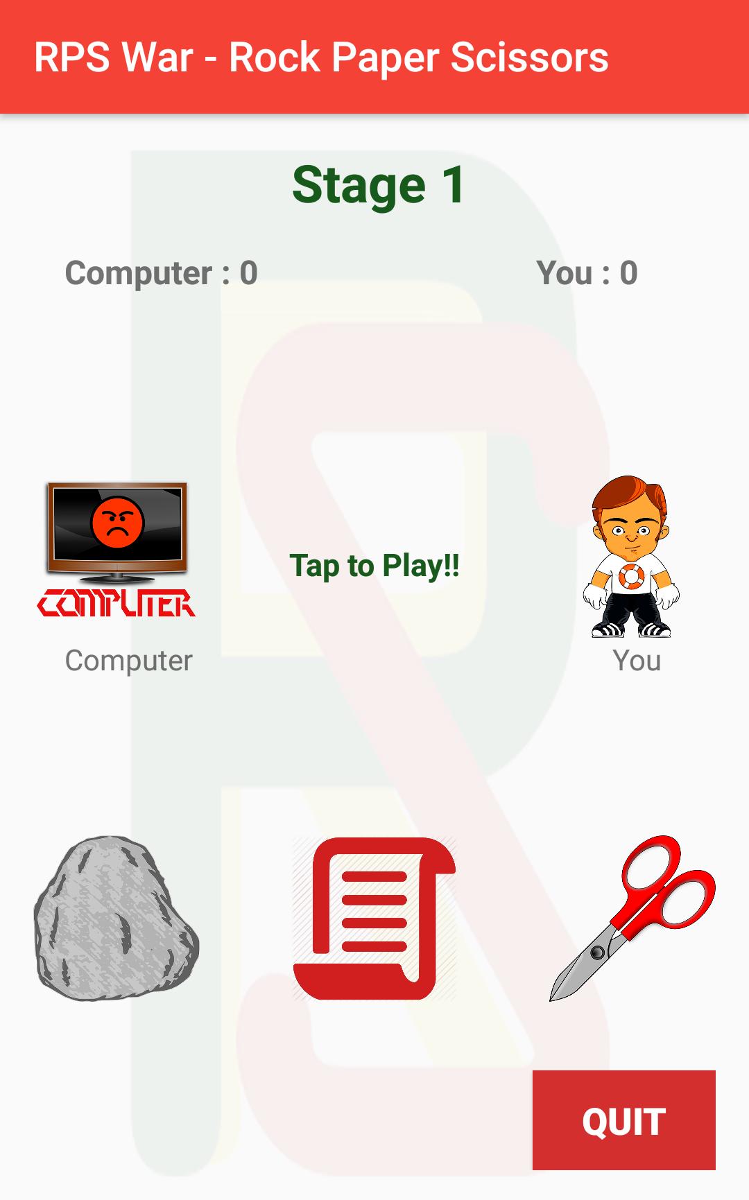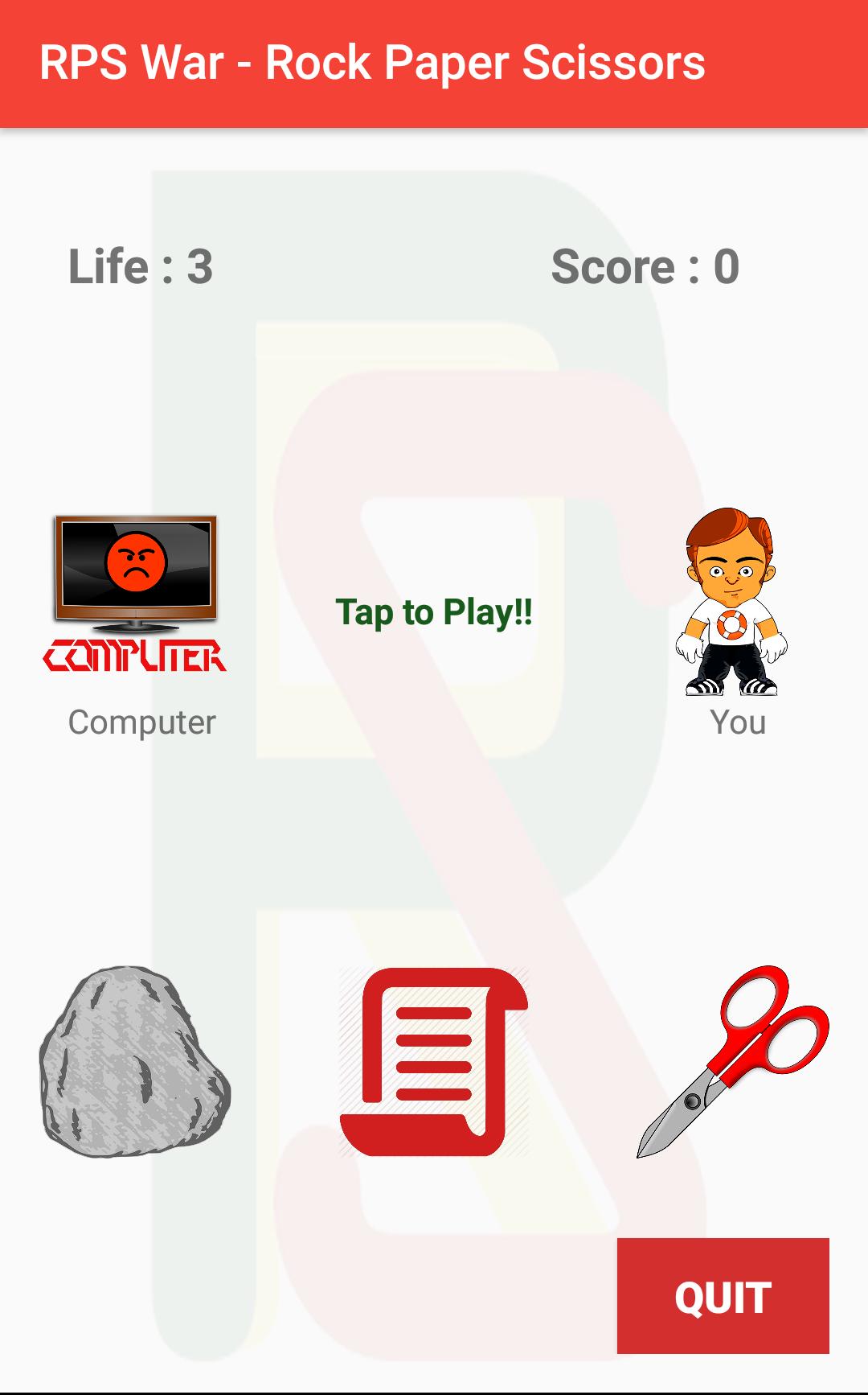 Bagaimana cara bermain RPS? Game yang sangat mudah. Anda akan melawan bot. Anda berdua harus memilih salah satu dari tiga hal Rock Paper dan Scissor secara bersamaan. Rock lebih kuat daripada gunting tetapi kurang kuat dari kertas. Gunting lebih kuat daripada kertas tetapi kurang kuat dari batu dan kertas lebih kuat daripada batu tetapi kurang kuat dari gunting. Saat Play Screen datang ketuk di atas kertas atau rock untuk bermain game.