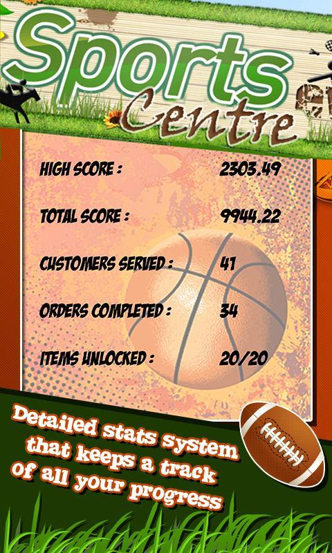 Sports Center melacak statistik dari semua yang Anda lakukan. Jumlah pelanggan yang telah Anda layani, jumlah uang tunai yang Anda peroleh, jumlah hari yang Anda habiskan dalam permainan - semuanya. Semakin baik Anda bermain, semakin banyak pencapaian yang akan Anda buka, dan semakin banyak Anda dapat membanggakannya untuk teman -teman Anda.