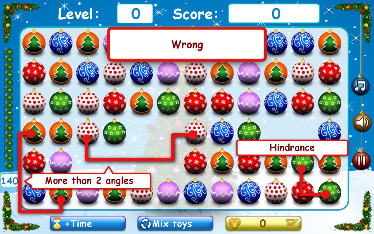 すべての次のレベルは、各動きの後の競技場の変化によって複雑になります(クリスマスツリーボールは、中央に流れ落ちます)。